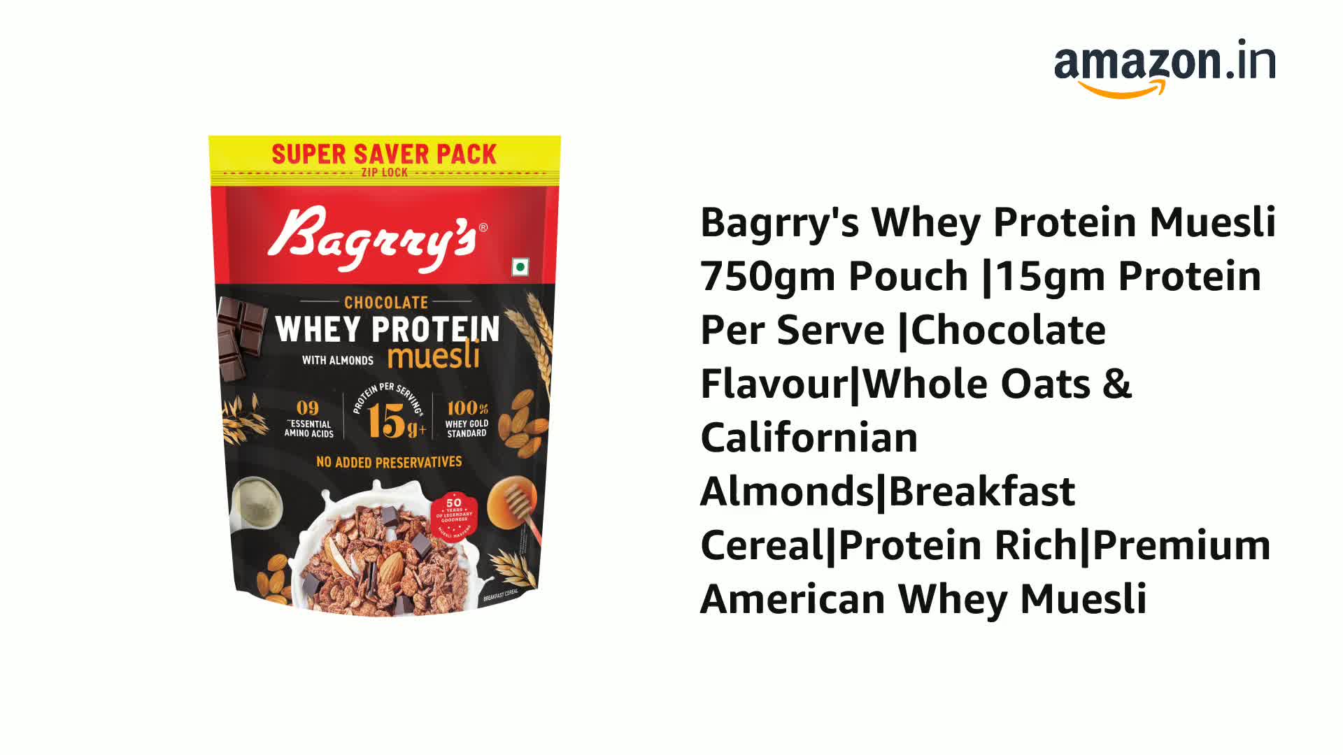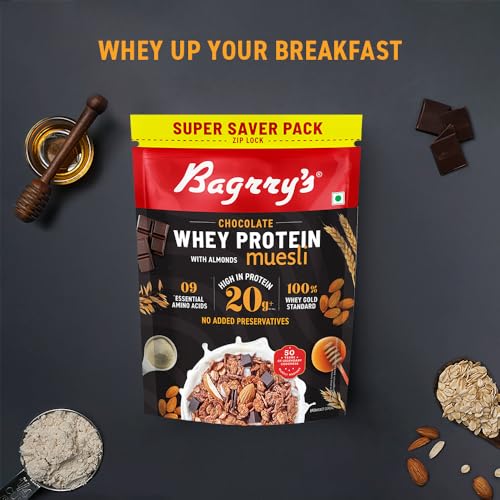 HomeGroceryHealthy BreakfastOats & MuesliBagrry's Whey Protein Muesli 750gm Pouch |15 g /20 g Protein Per Serve |Chocolate Flavour|Whole Oats & Californian Almonds|Breakfast Cereal|Protein Rich|Premium American Whey Muesli