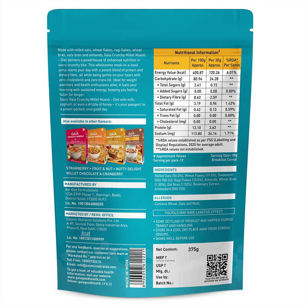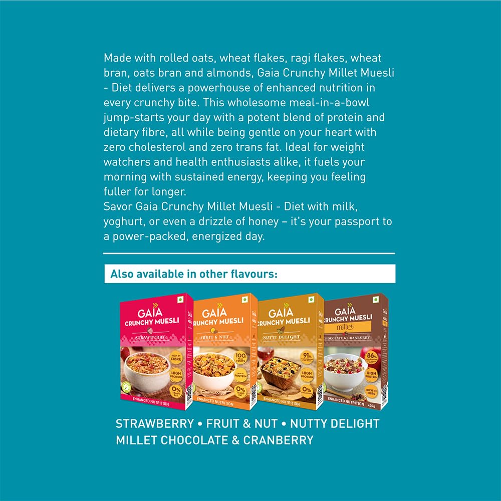 Gaia Crunchy Millet Muesli | High on Proteins | Low on Cholesterol | No Trans-Fat | Sugar Free | No Preservatives | Abundance of Antioxidants Diet 375Gm