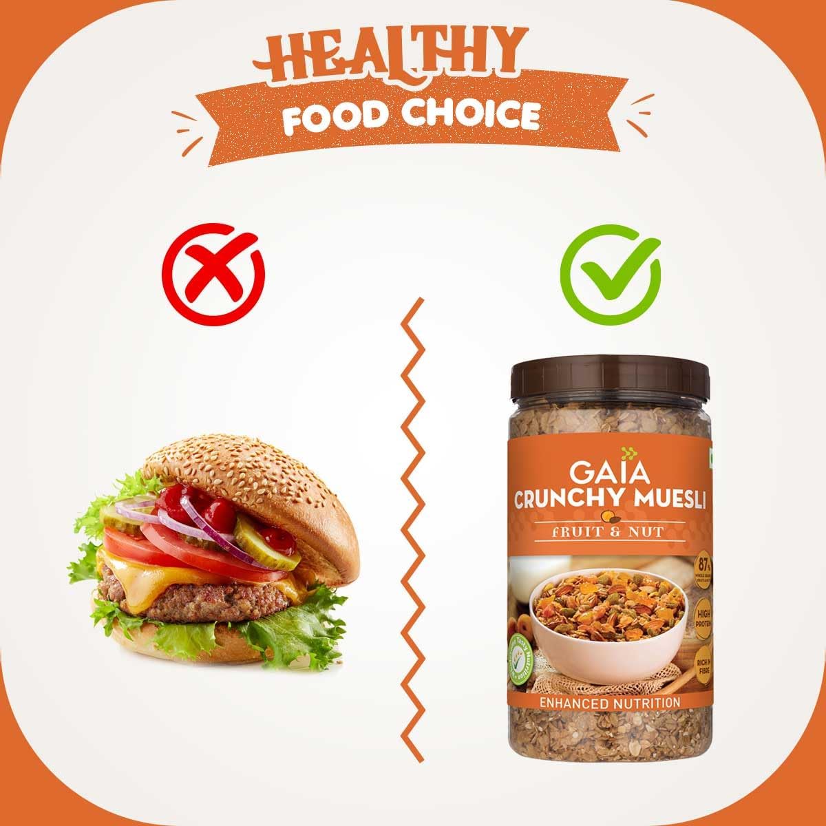 HomeGroceryHealthy BreakfastOats & MuesliGaia Crunchy Muesli Fruit and Nuts a Mix of Wholesome Breakfast Cereals Packed with Fibre Iron and Antioxidants Serves As the Nourishing Tasty Breakfast Option. 1KG Jar Pack