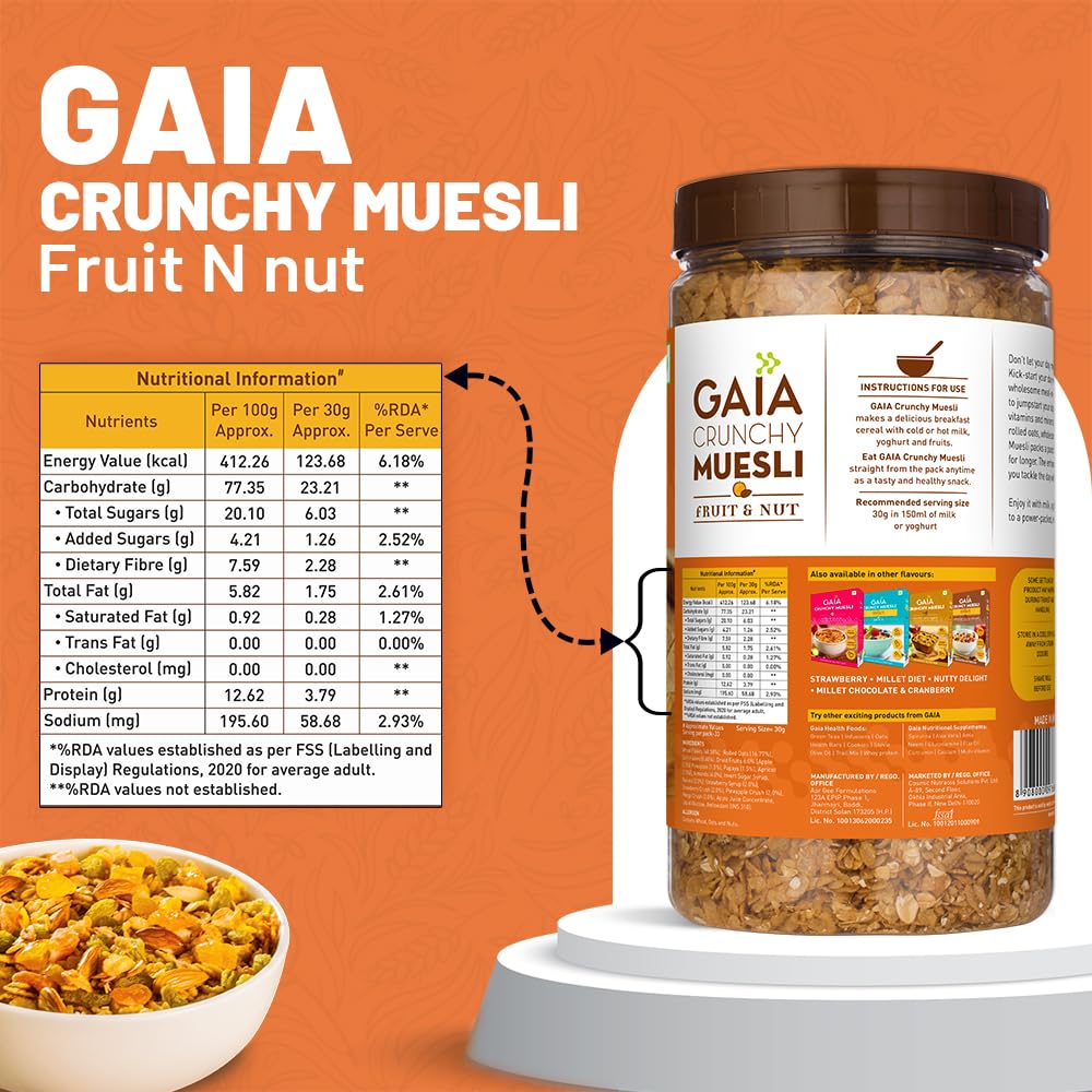 Gaia Crunchy Muesli Fruit and Nuts a Mix of Wholesome Breakfast Cereals Packed with Fibre Iron and Antioxidants Serves As the Nourishing Tasty Breakfast Option. 1KG Jar Pack