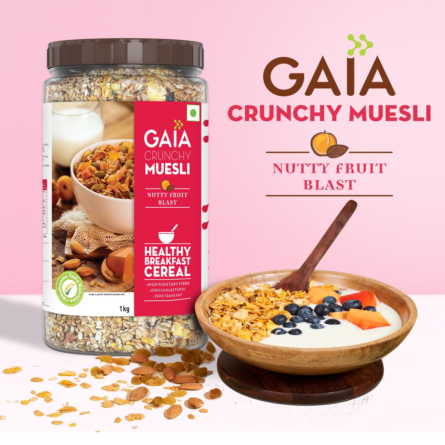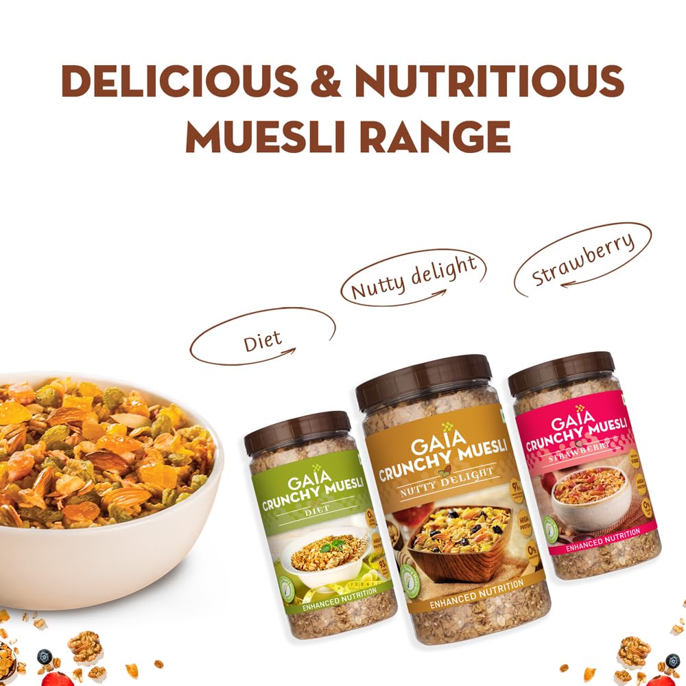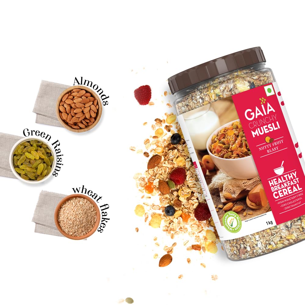 HomeGroceryHealthy BreakfastOats & MuesliGAIA Nutty Fruit Blast Crunchy Muesli 1 kg jar - Blend of Multigrains Nuts Oats and Cornflakes The Ultimate Healthy and Delicious Breakfast Cereals.