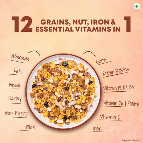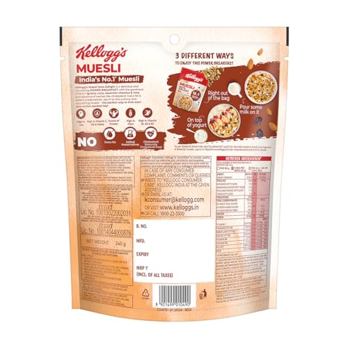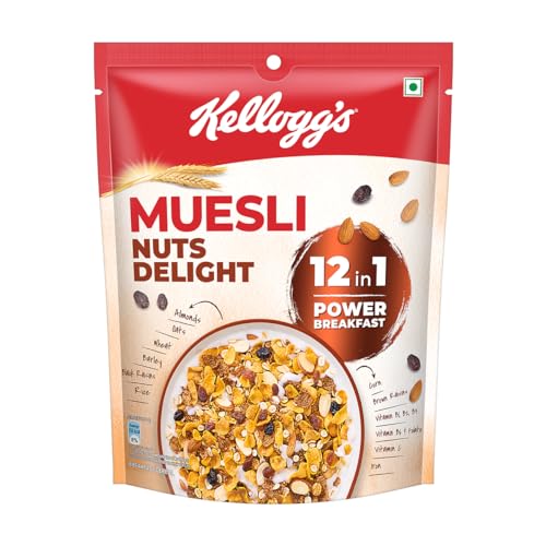 Nourishing & Tasty Breakfast Cereal â Say Hi to a delightful POWER BREAKFAST filled with goodness of 12 in 1 bowl. It is infused with the goodness of multigrain almonds and raisins. This Muesli breakfast will help you kick-start your mornings. It is a nourishing and tasty meal that will get you ready to seize your action-packed day. IndiaNo.1* Muesli: KelloggMuesli is IndiaNo. 1 Muesli brand (*refer pack/website for details). Power Breakfast for a Healthy Start: Made with nutritious grains & delicious inclusions â the âNew KelloggMuesli Nuts Delight 12-in-1 Power Breakfast comes with the goodness of 5 baked grains (Oats Wheat Barley Corn & Rice) an abundance Almonds & Raisins along with essential vitamins & iron - giving this Muesli a yummy blend of flavour and crunchy texture in your breakfast bowl. Powerhouse of nutrients: This power-packed breakfast is high in Iron Vitamin C B6 & Folate. It is high in fibre Vitamins B1 B2 & B3 and is also a source of protein. No Nasties: KelloggMuesli has no trans-fat and no added preservatives. It is also naturally cholesterol-free. 3 ways to enjoy this Power Breakfast â Have it right out of the bag or have it in a bowl and pour some milk on it or couple it with yogurt. Just take a handful of KelloggMuesli and feel naturebounty in its grainy nutty goodness! Your Go-To Breakfast â KelloggMuesli gives you a perfect start with multigrain energy for busy mornings. You can count on Kelloggfor a great-tasting convenient and a nourishing breakfast that fuels your hunger to achieve.
