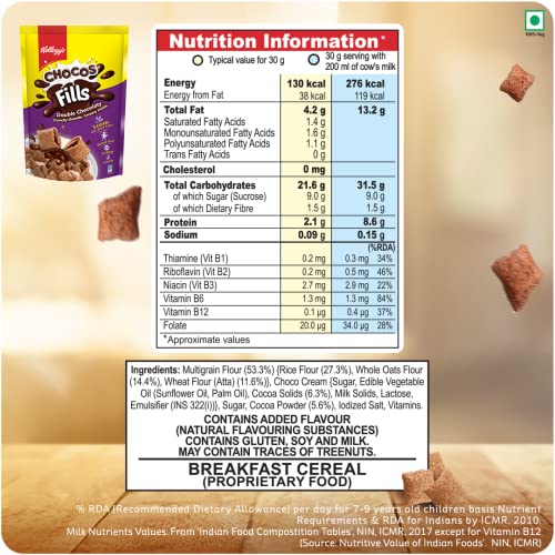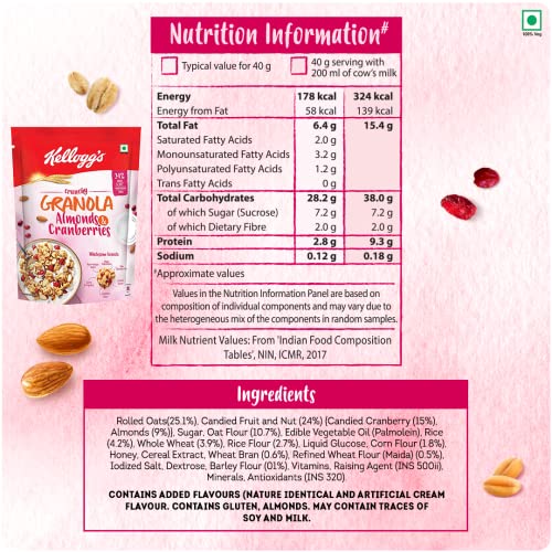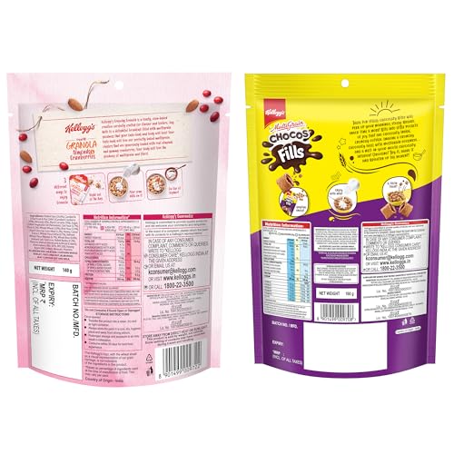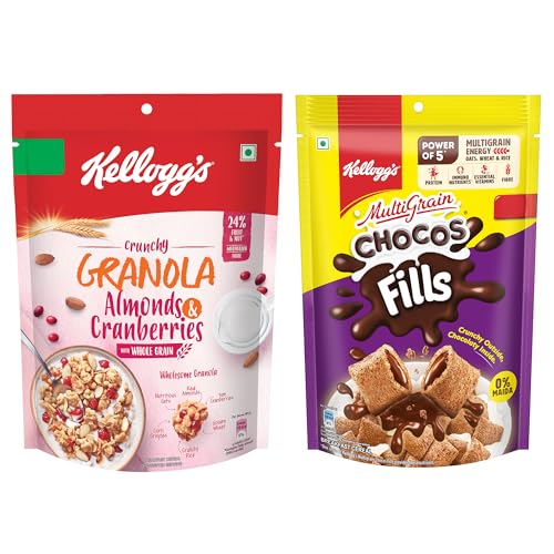 Kellogg's Chocos Fills Double Chocolaty - Filled pillows which are crunchy chocolaty outside and chocolaty inside. It is an anytime anywhere snack. Experience yummy taste of kelloggs chocos fills during breakfast between lectures while travelling or late - night munching. Kellogg's Granola ALmonds & Cranberries - Enjoy baked multigrain clusters of whole-grain oats wheat corn rice and barley generously loaded with real almonds and cranberries.