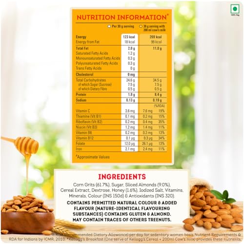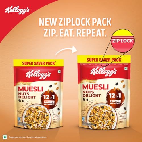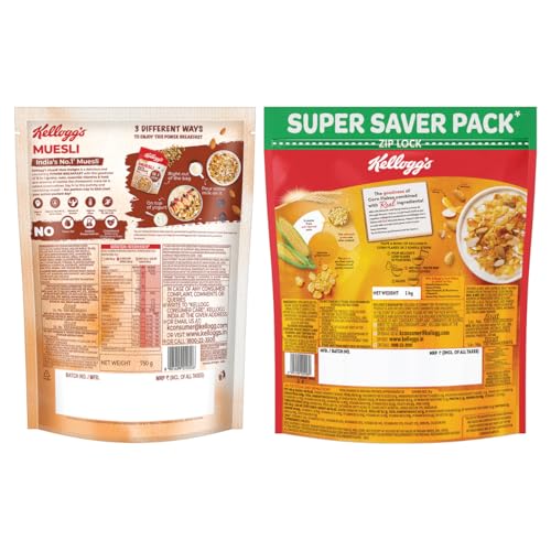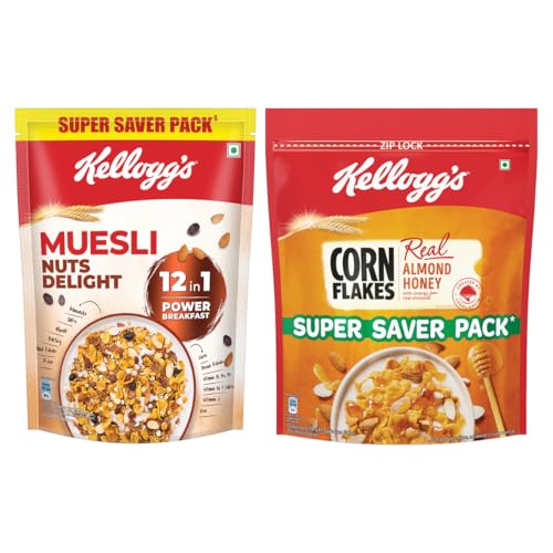 Kellogg's Corn Flakes Real Almond and Honey 1 kgKellogg's Corn Flakes Real Almond and Honey 1 kgKellogg's Muesli with 20% Nuts Delight Pouch 750 gKellogg's muesli nuts delight with the goodness of 5 baked grains and a generous blend of raisins and crunchy almonds is carefully crafted for flavour and texture. Say hello to a delightful breakfast filled with multigrain goodness that will jump-start your mornings and get you ready for the day. Its beauty lies in its simplicity - just take a handful of Kellogg's muesli and feel nature's bounty in its grainy nutty goodness!.