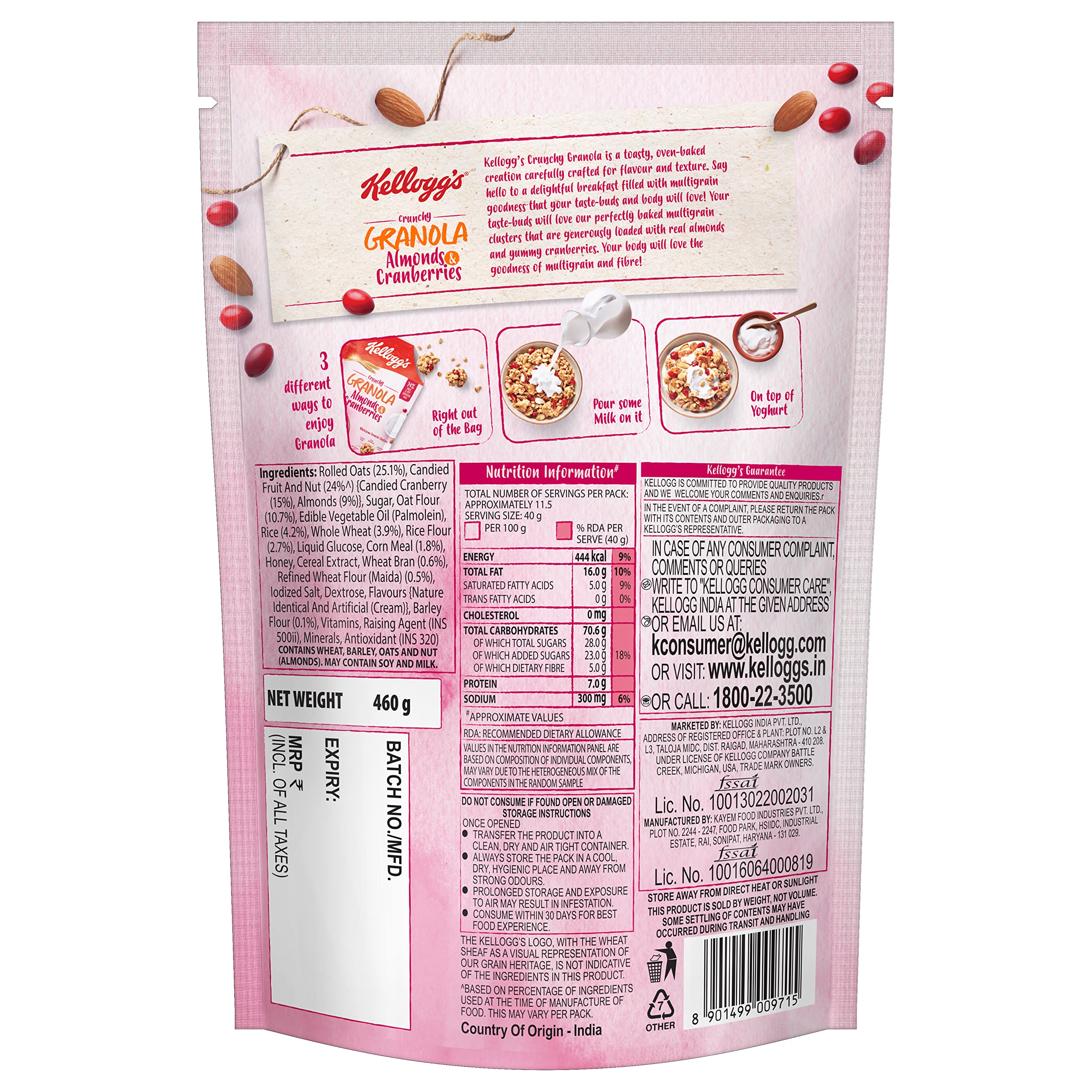 Baked Goodness - Kellogg's Crunchy Granola is toasty oven-baked creation carefully crafted for flavor and texture. Your taste-buds will love our perfectly baked multigrain clusters that are generously loaded with 24% real almonds & yum cranberries.