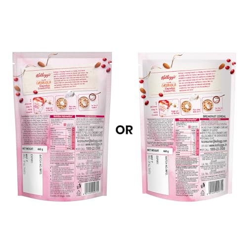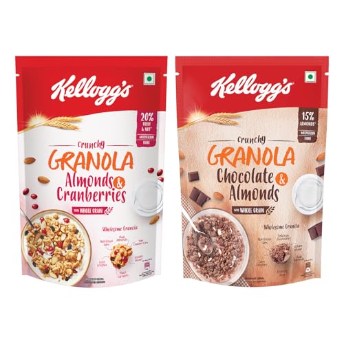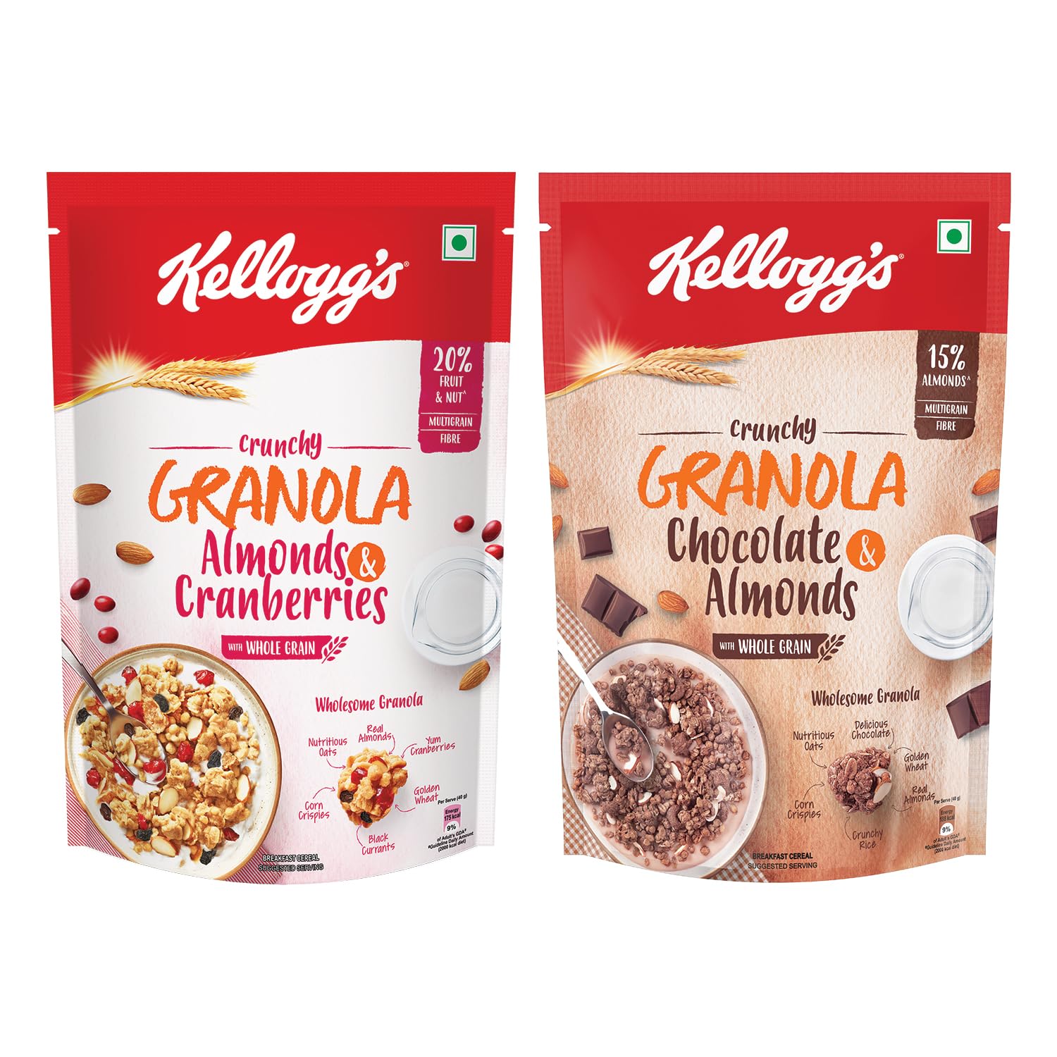 Kellogg's Crunchy Granola Almonds and Cranberries 460gNew KelloggCrunchy Granola is toasty oven-baked creation carefully crafted for flavour and texture. Your taste-buds will love our perfectly baked clusters that are generously loaded with the goodness of 5 grain and 24 Percent Fruit and Nut. It is loaded with yummy cranberries and real almonds to give your day the perfect start. Enjoy baked multigrain clusters of whole-grain oats wheat corn rice and barley generously loaded with real almonds and cranberries.Kellogg's Crunchy Granola Chocolate & Almonds 450 gKellogg's crunchy granola is a toasty oven-baked creation carefully crafted for flavour and texture. Say hello to a delightful breakfast filled with multigrain goodness that your taste-buds and body will love. Your taste-buds will love our perfectly baked chocolaty multigrain clusters that are generously loaded with crunchy almonds. Your body will love the goodness of multigrain and fibre.