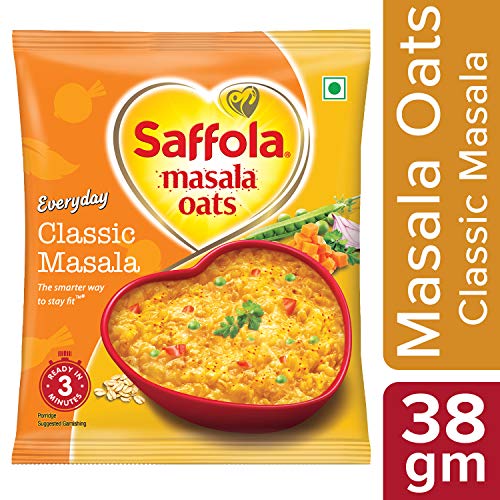 Saffola Masala Oats brings to a range of delightful flavours for a delicious anytime snack. It is made with wholegrain oats real vegetables & chatpata mix of spices to give you a delectable warm bowl of enjoyment that balances out chatpata cravings with health. What's more is that it gets ready to eat in just 3 minutes so that you can enjoy this delicious healthy snacks whenever you want! Devour it as a snack for anytime taste cravings or as a delicious and delightful family breakfast cereal! Available in a range of yummy flavours - Classic Masala : for the classic masaledar experience | Veggie Twist: for the comforting blend of spices and vegetables | Peppy tomato: for a tangy indulgence | Masala Coriander: for the aromatic coriander flavour. Order your pack of this delicious healthy snack today and say bye to your chatpata cravings! Did you know? Saffola Masala Oats is made with wholegrain oats a cereal that is high in fibre and in protein which keep you fuller for longer controls your hunger pangs and thereby helps you manage weight.