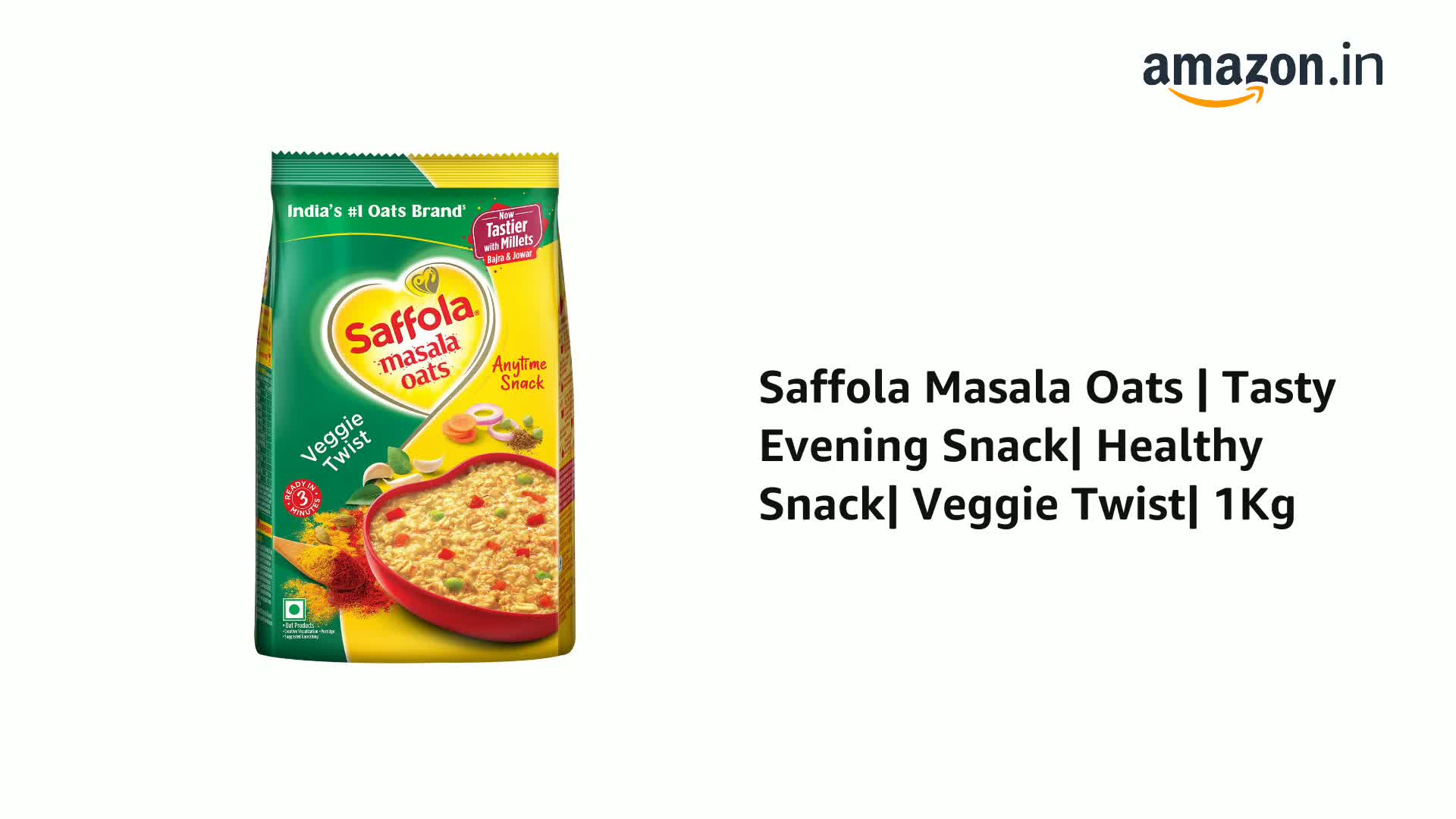 Saffola Masala Oats Veggie Twist | Tasty, Anytime Snack | Ready in 3 mins | Millets Goodness- with Bajra & Jowar | No maida , No added preservatives | helps manage weight |1kg