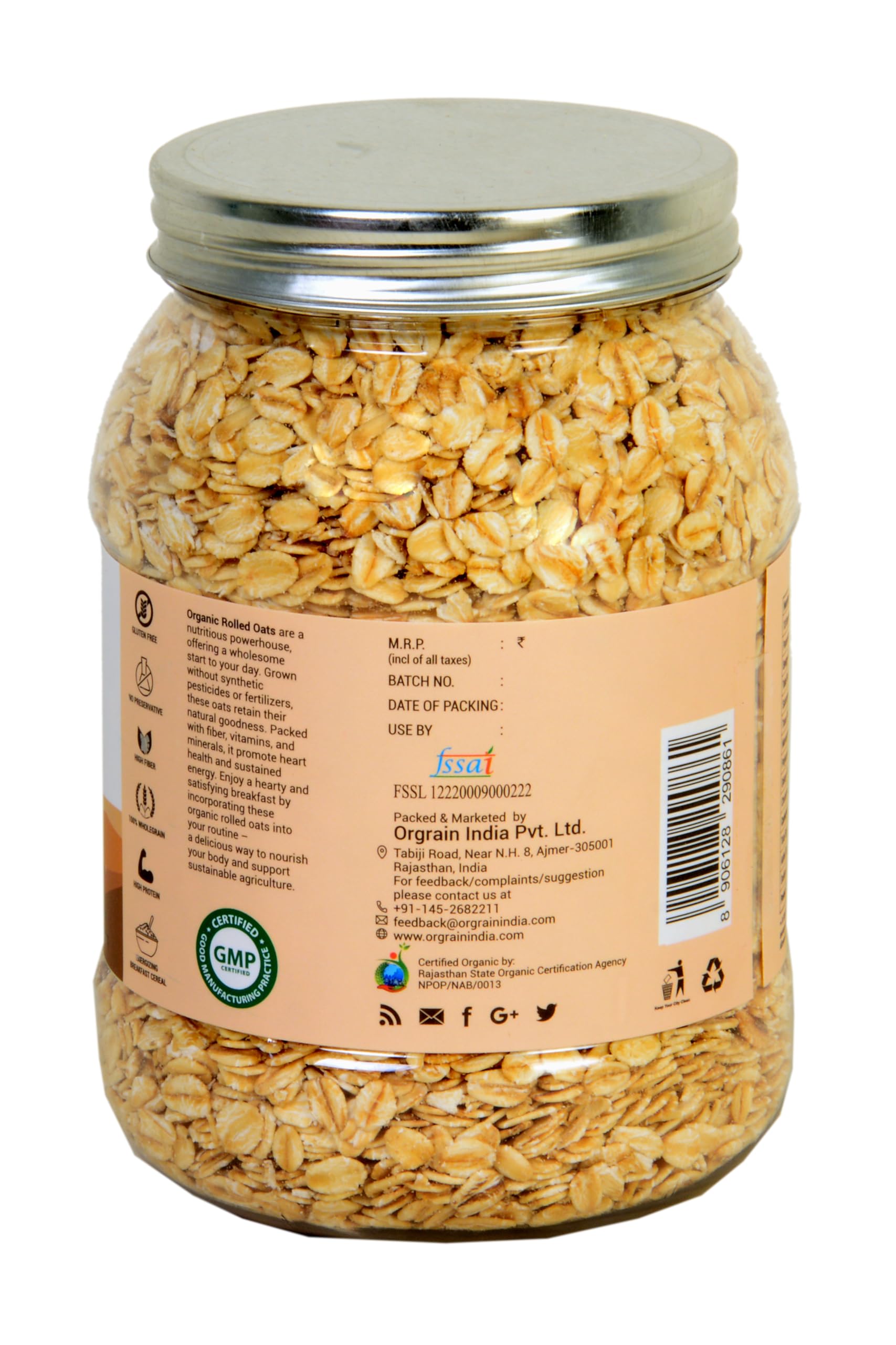 Orgrain India Organic Rolled Oats 500g | Gluten Free Oats | Healthy Breakfast Cereal | Whole Grain Old Fashion Jumbo Rolled Oats with High Fibre Protein | Diet food for Weight Management