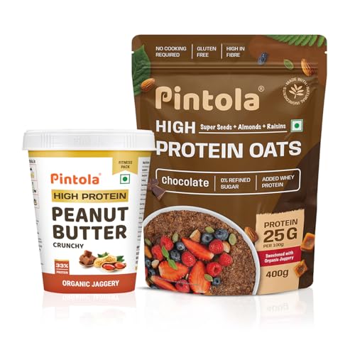 HomeGroceryFlavorsNut & Seed ButterPintola Fitness Combo: High Protein Organic Jaggery Crunchy Peanut Butter 510g, Whey Protein, Zero Added Salt & 22g High Protein Dark Chocolate Oats 400g, No Refined Sugar, Gluten-Free, High Fiber