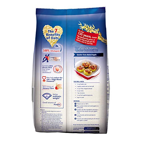 Product description Start your morning with a wholesome bowl of Quaker Oats- the perfect breakfast porridge for the whole family. Quaker oats is made from 100 percent wholegrain oats which is a natural source of carbohydrates protein and dietary fibre. It helps reduce the risk of high blood pressure and cholesterol. It is easy to prepare in just 3 minutes and blends into almost any recipe enhancing its nutritional value without compromising on taste. Preparation: Add ½ cup of Oats 1 glass skimmed milk and cook for 2 to 3 minutes on stove/microwave. Add sugar/honey as per your taste. Top it up with your favourite fruits and nuts to make it more delicious and nutritious. Nutritional information (per 100g): Energy - 407 Kcal Protein - 11.8 g Total Fat -9.5 g Total Carbohydrate - 68.5 g Total Dietary Fibre - 10 g Iron - 2.5 mg Magnesium - 106mg Sodium - 9.5 mg Zinc - 2.0 mg Ingredients: Oats About the brand - For over 135 years Quaker has unlocked the power of oats to help people get the perfect start to each day.