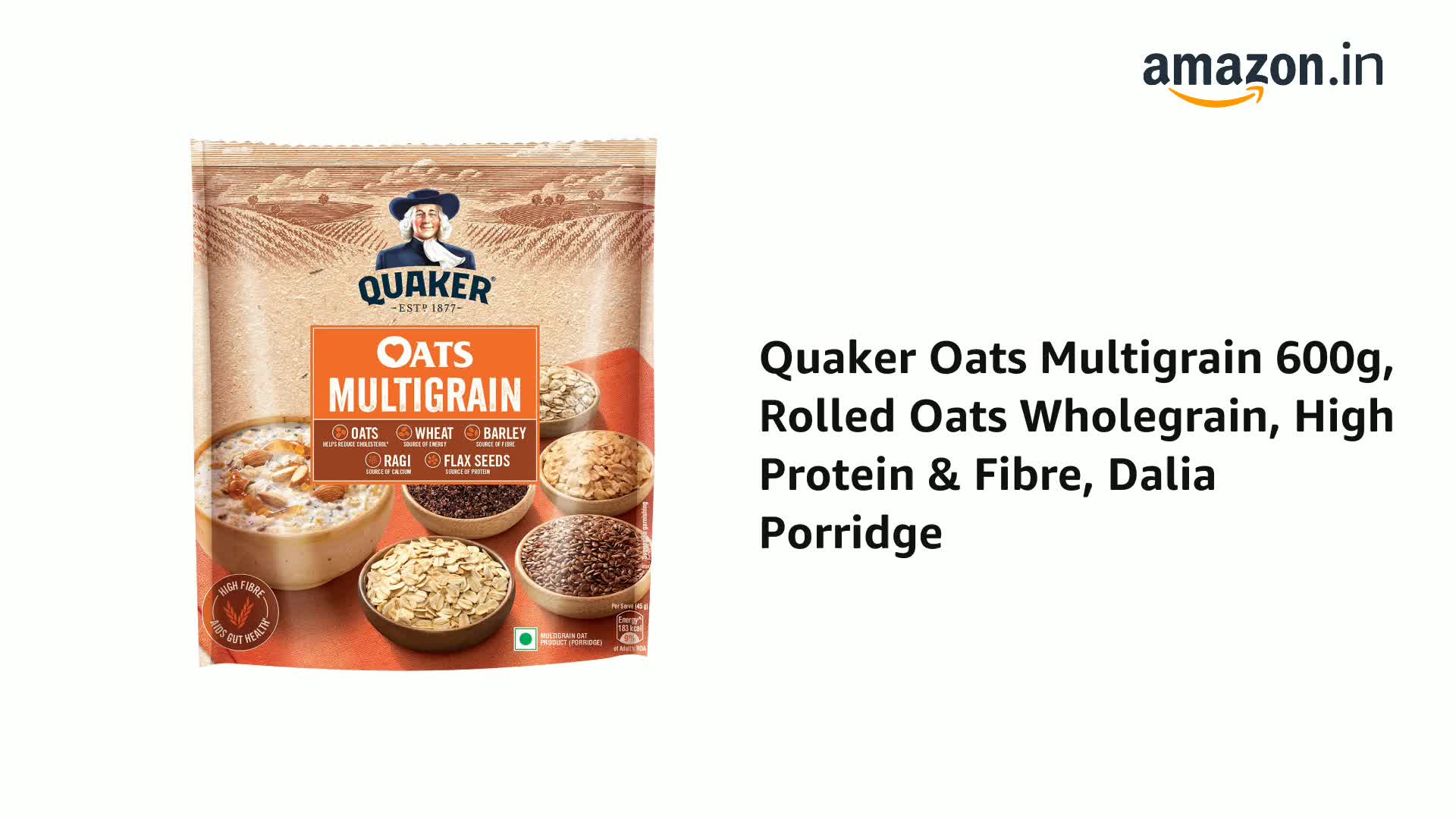 "Start your day with the Power of 5 with Quaker Oats Multigrain!Get the goodness of 5 with Whole Oats Wheat Barley Ragi and Flax Seeds. Quaker Oats Multigrain gives you the energy to do more of what you love. Made with Natural Wholegrain Oats have complex carbohydrates that break down slowly to provide nutritious energy Barley is rich in fiber Ragi for calcium and Flax Seeds as a good source of protein. Multigrain consists of Oats that help maintain weight and support your fitness journey.One serving of Quaker Oats Multigrain (~45g of dry product) provides you with energy equal to 2 Phulkas (Rotis) Fiber equivalent to 1¼ Apples and protein quantity equal to ½ a cup cooked Chana Dal. Get a good start with the benefits of multigrain in a warm bowl of Quaker Oats Multigrain in just 4 minutes. Try it with delicious toppings of fresh or dried fruits nuts or cinnamon. Key benefits: Power of 5 Whole Oats Wheat Barley Ragi and Flax Seeds Made of wholegrain Oats Nutritious Energy High in Fiber that aids Gut Health Source of Protein*Wholegrain Whole Oat Flakes (60%). **Based on 1 serve (45g) of dry product. ***Product is a rich source of fiber (WHO/Wholegrain council). ****Nutrients requirements for Indians 2020. *****Dietary Guidelines for Indians 2011."