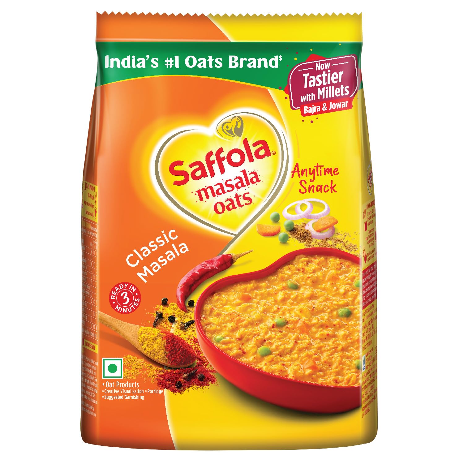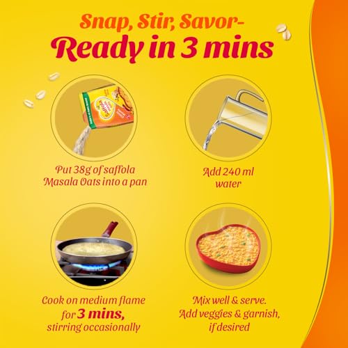Saffola Masala Oats brings to a range of delightful flavours for a delicious anytime snack. It is made with wholegrain oats real vegetables & chatpata mix of spices to give you a delectable warm bowl of enjoyment that balances out chatpata cravings with health. What's more is that it gets ready to eat in just 3 minutes so that you can enjoy this delicious healthy snacks whenever you want! Devour it as a snack for anytime taste cravings or as a delicious and delightful family breakfast cereal.