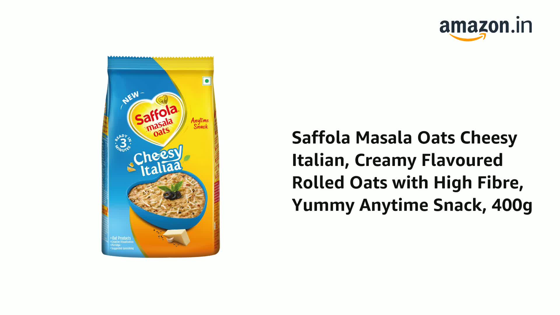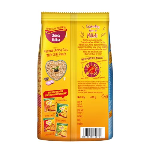 Saffola Masala Oats in a brand new avatar with the indulgent Italian flavoured oats with the perfect mix of cheese & a tasty punch of chilli! Made with real vegetables Saffola Masala Oats Cheesy Italiaa gives you a delightful eating experience teleporting you straight to the flavourful land of Italy! This Saffola Masala Oats pack has bright veggies like corn and green bell pepper Italian herbs and rich Indian Millets like Jowar & Rolled Oats that enhance your consumption experience. Now experience the joy of Italian cuisine at your homes whenever you like without compromising on health.. This is a perfect snack for anytime and anyday. What's more is that it is ready to eat in just 3 minutes - super convenient to make super tasty to eat and super hard to resist! Saffola Masala Oats Cheesy Italiaa is made with wholegrain Oats cheese & real negetables and is high in fibre and protein keeping you fuller for longer helping you control your hunger pangs and manage weight without compromising on taste. Millets one of the oldest crops used traditionally are nutritious & when combined with the goodness of Oats it turns out to be a wholesome food. Moreover cheese with spicy chilli twist make snacking a delightful experience.
