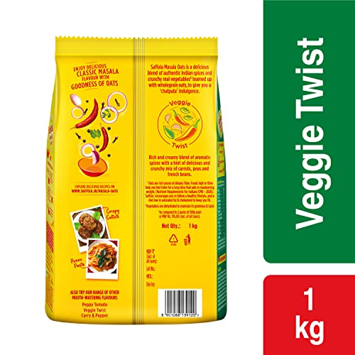 Saffola Masala Oats | Tasty Evening Snack| Healthy Snack| Veggie Twist| 1KgSaffola Masala Oats brings to you a range of delightful flavours making for a perfect evening snack. Made with wholegrain oats real vegetables & a tasty mix of authentic desi spices Saffola Masala Oats forms a delectable warm bowl of joy. What's more is that it is ready to eat in just 3 minutes - super convenient to make super tasty to eat and super hard to resist! You can also enjoy Saffola Masala Oats in a variety of tasty recipes like Crispy Cutlets Penne Pasta or just as a delicious bowl of joy with crunchy topping like namkeen peanuts or crushed papad. Saffola Masala Oats is available in a range of lip-smacking flavours - Classic Masala for the classic masaledar experience | Veggie Twist for the comforting blend of spices and vegetables | Peppy tomato for a tangy indulgence | Masala Coriander for the tasty mix of desi spices with coriander notes | Curry & Pepper with a lingering aroma of curry leaves. Made with wholegrain Oats & real vegetables Saffola Masala Oats is high in fibre and protein keeping you fuller for longer helping you control your hunger pangs and manage weight.Saffola Masala Oats | Tasty Evening Snack| Healthy Snack| Peppy Tomato| 500gSaffola Masala Oats brings to you a range of delightful flavours making for a perfect evening snack. Made with wholegrain oats real vegetables & a tasty mix of authentic desi spices Saffola Masala Oats forms a delectable warm bowl of joy. What's more is that it is ready to eat in just 3 minutes - super convenient to make super tasty to eat and super hard to resist! You can also enjoy Saffola Masala Oats in a variety of tasty recipes like Crispy Cutlets Penne Pasta or just as a delicious bowl of joy with crunchy topping like namkeen peanuts or crushed papad. Saffola Masala Oats is available in a range of lip-smacking flavours - Classic Masala for the classic masaledar experience | Veggie Twist for the comforting blend of spices and vegetables | Peppy tomato for a tangy indulgence | Masala Coriander for the tasty mix of desi spices with coriander notes | Curry & Pepper with a lingering aroma of curry leaves. Made with wholegrain Oats & real vegetables Saffola Masala Oats is high in fibre and protein keeping you fuller for longer helping you control your hunger pangs and manage weight.