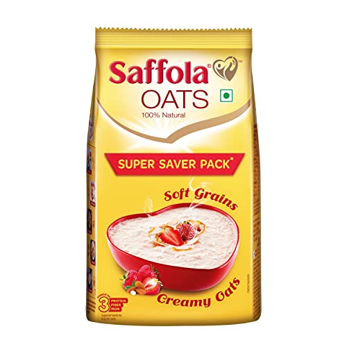 Saffola Oats are made with 100% natural wholegrain rolled oats. Its grains are so soft that it provides a super creamy texture to your breakfast. Porridge prepared by Saffola Oats is so creamy that it melts in your mouth. Relish a quick bowl of Saffola Oats by simply adding your favorite toppings like fruits honey syrup etc. Ready in 3 minutes; Saffola Oats can be had as a hot bowl of oats or a yummy cold dessert. Apart from porridge you can also try other lip-smacking recipes like Oats Upma Uttapam Daliya Smoothies etc. as these soft grains blend easily into your recipes. Packed with the Power of 3 Protein Fiber and Iron; Saffola Oats ensures you get nutrition packed breakfast. The high fiber content keeps you fuller for longer and provides long-lasting energy suitable for today's active lifestyle. Available in 200g 400g 500g 1kg & 1.4kg pack sizes Also try our delicious range of Saffola Masala Oats flavours - Classic Masala: for the classic masaledaar experience | Veggie Twist: for the comforting blend of spices and vegetables | Peppy tomato: for a tangy indulgence | Masala Coriander: for the aromatic coriander flavour. Order your pack of this delicious healthy snack today and say bye to your chatpata cravings!