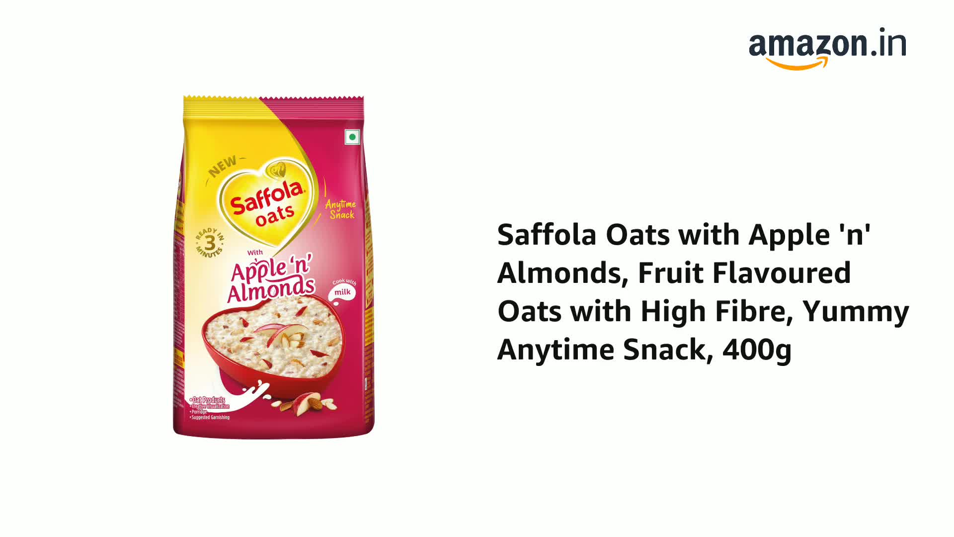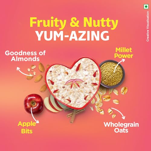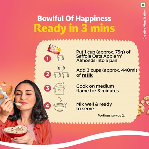 Saffola Oats in a brand new avatar with the indulgent fruity flavoured oats mixed with real nuts! Made with real fruits & nuts Saffola Oats with Apple 'n' Almonds gives you a delightful eating experience. This Saffola Oats pack has bright fruits like apple slices and tasty almonds. Along with this rich Indian Millets like Jowar & Rolled Oats are also present that enhance your consumption experience. Now experience the joy of sweet & fruity oats at your homes whenever you like without compromising on health.. This is a perfect snack for anytime and anyday. Just cook it in milk and it is ready to eat in just 3 minutes - super convenient to make super tasty to eat and super hard to resist! Saffola Oats with Apple 'n' Almonds is made with wholegrain Oats apple slices almonds and the warm touch of cinnamon. It is high in fibre and protein and keeps you fuller for longer helping you control your hunger pangs and manage weight without compromising on taste. Millets one of the oldest crops used traditionally are nutritious & when combined with the goodness of Oats it turns out to be a wholesome food. Moreover a nutritious fruity delight in a nutty avatar makes snacking a delightful experience.