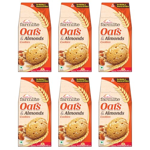 Sunfeast Farmlite digestive oats provides the goodness of oats as healthy & tasty biscuits. These health-filled biscuits have high oats content are made from aashirvaad atta and are available in 3 tasty variants â almonds raisins & chocolate. You can feel the dash of almonds and crunchy oats in every bite of this healthy and tasty delight. Sunfeast Farmlite biscuits is the only health biscuit range in the world that is: made from aashirvaad atta| no maida | no trans fat |no cholesterol.