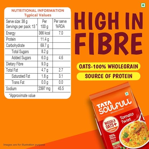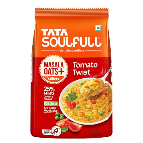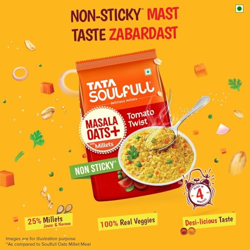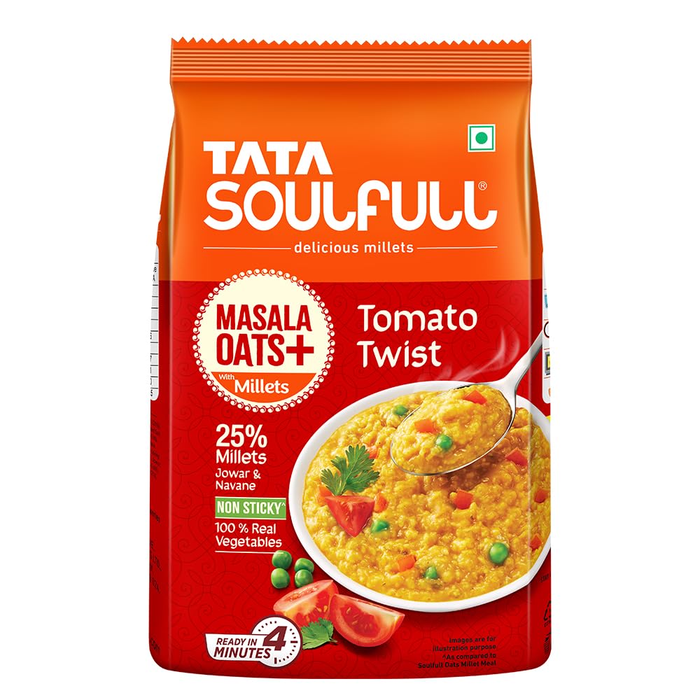 Drive your evening snack craving away the DESI-LICIOUS way with TATA SOULFULL MASALA OATS+. Tata Soulfull Masala Oats+ Tomato Twist combines the goodness of whole grain oats crunchy Indian millets (jowar & Navane) desi masalas and 100% real veggies. It's a mouth-watering desi snack bursting with taste and texture! Ready in just 4 minutes this ready-to-eat Masala Oats is super convenient to prepare and also high in fiber and a good source of protein. Why Millets? Jowar also known as sorghum is a popular millet in the north that is rich in protein and fiber. Foxtail millet popularly known as Navane in Karnataka or Kakum in Hindi is high in carbohydrates and has minerals such as copper & iron. Yes Millets are nutritious but that's not all - they also add crunchy texture making the product NON-STICKY. Storage: Store away from direct heat or sunlight. Usage: Take half cup (38 g) of Masala Oats from the pack. Add 1.5 cups (250 ml) of water to it. Cook on a medium flame for 4 minutes while stirring continuously. If microwaving cook the product for 4 minutes and stir occasionally. Serve hot. Add vegetables & garnish if necessary.
