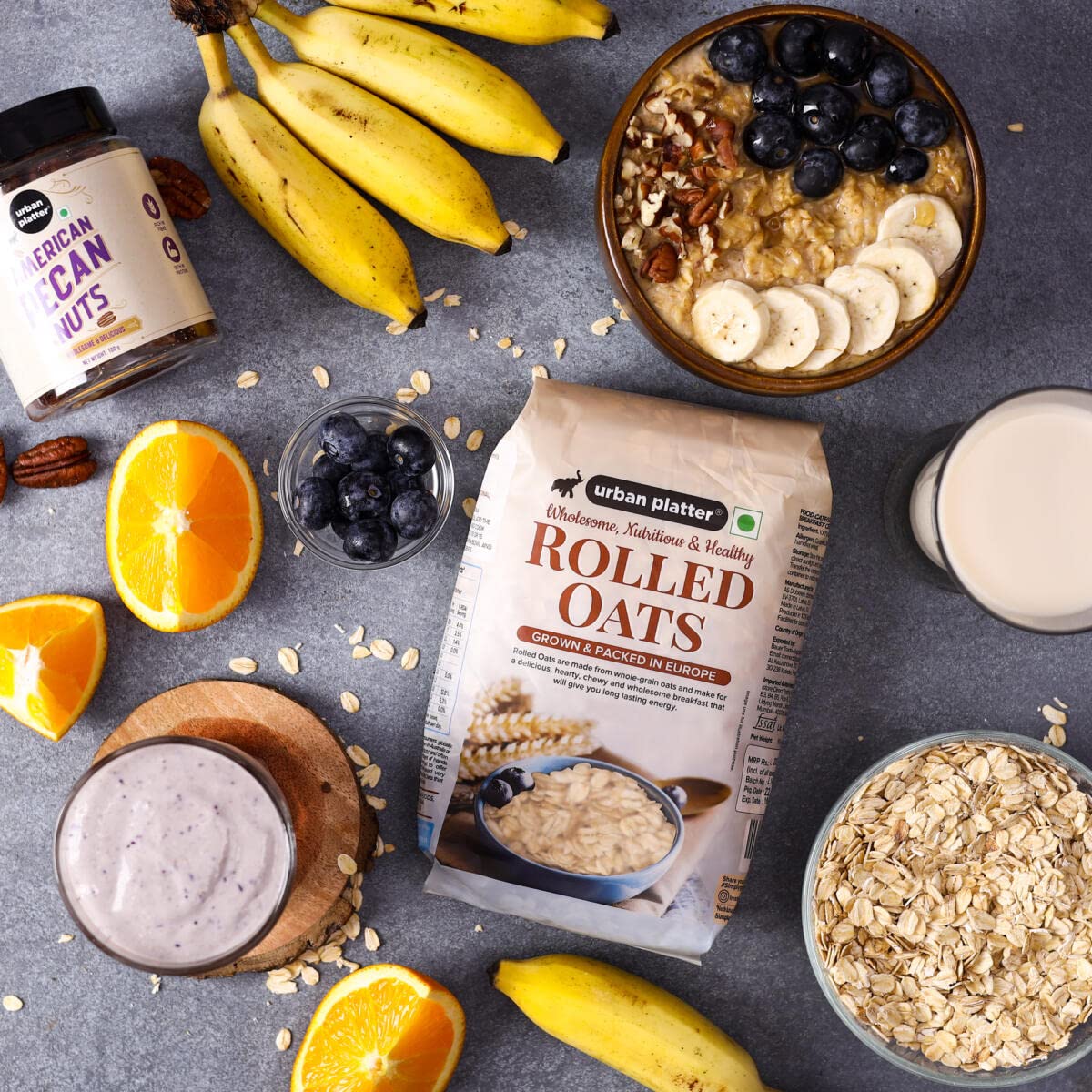 PRODUCT OF EUROPE : Urban Platterâ€s Rolled Oats are grown and packed exclusively in Europe and are jumbo in size. BREAKFAST ESSENTIAL : Made from whole-grain oats our Jumbo Rolled Oats make for delicious and wholesome breakfast essential. NUTRITIONAL POWERHOUSE : Extremely high in fiber and protein our Rolled Oats are power-packed with nutrition to give you long-lasting energy. WHERE TO USE : Use our Rolled Oats to make porridge oatmeal smoothie bowls granola bars and so much more! Urban Platter - Simply Good Food! :)