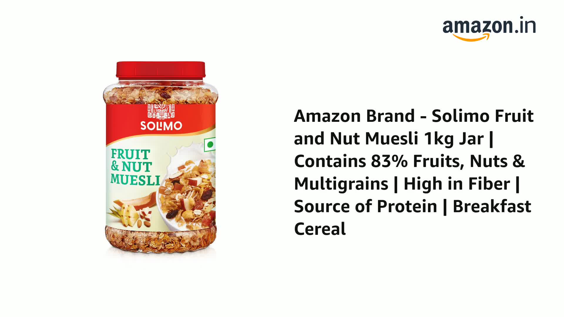 Introducing the Amazon Brand Solimo Fruit and Nut Muesli 1 kg Jar. Packed with the power of 82.68% Fruits Nuts & Multigrains the mix is delicious. It is naturally cholesterol-free and low in saturated fat to help you get through the day. The mix can be had with milk yogurt or even with dry fruits to make for a delicious breakfast. It also makes for a great on-the-go snack.