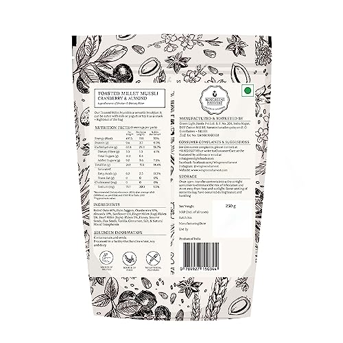 Wingreens Harvest Toasted Millet Muesli 250 g Cranberry & Almond Natural Breakfast Cereal Healthy Gluten-Free Cereals with Whole Grains Dried Fruits Nuts and Seeds No Artificial Preservatives