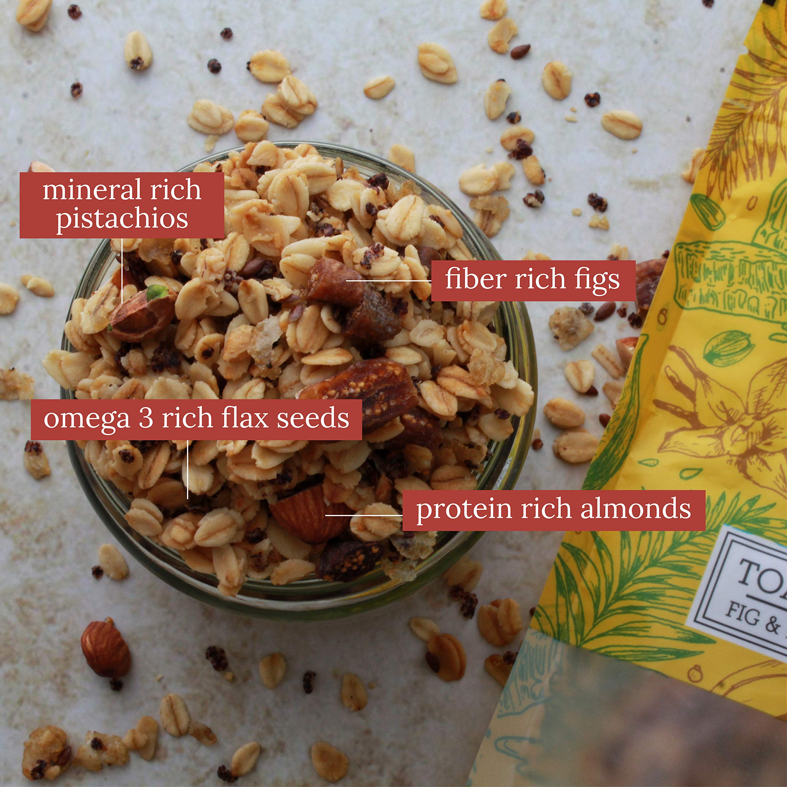 Dry fruit based muesli : Filled with the finest quality dry figs which are rich in dietary fiber calcium and potassium. And the lightly salted pistachio nuts are rich in vitamin B6 thiamine vitamin E and promote good cardiovascular health.