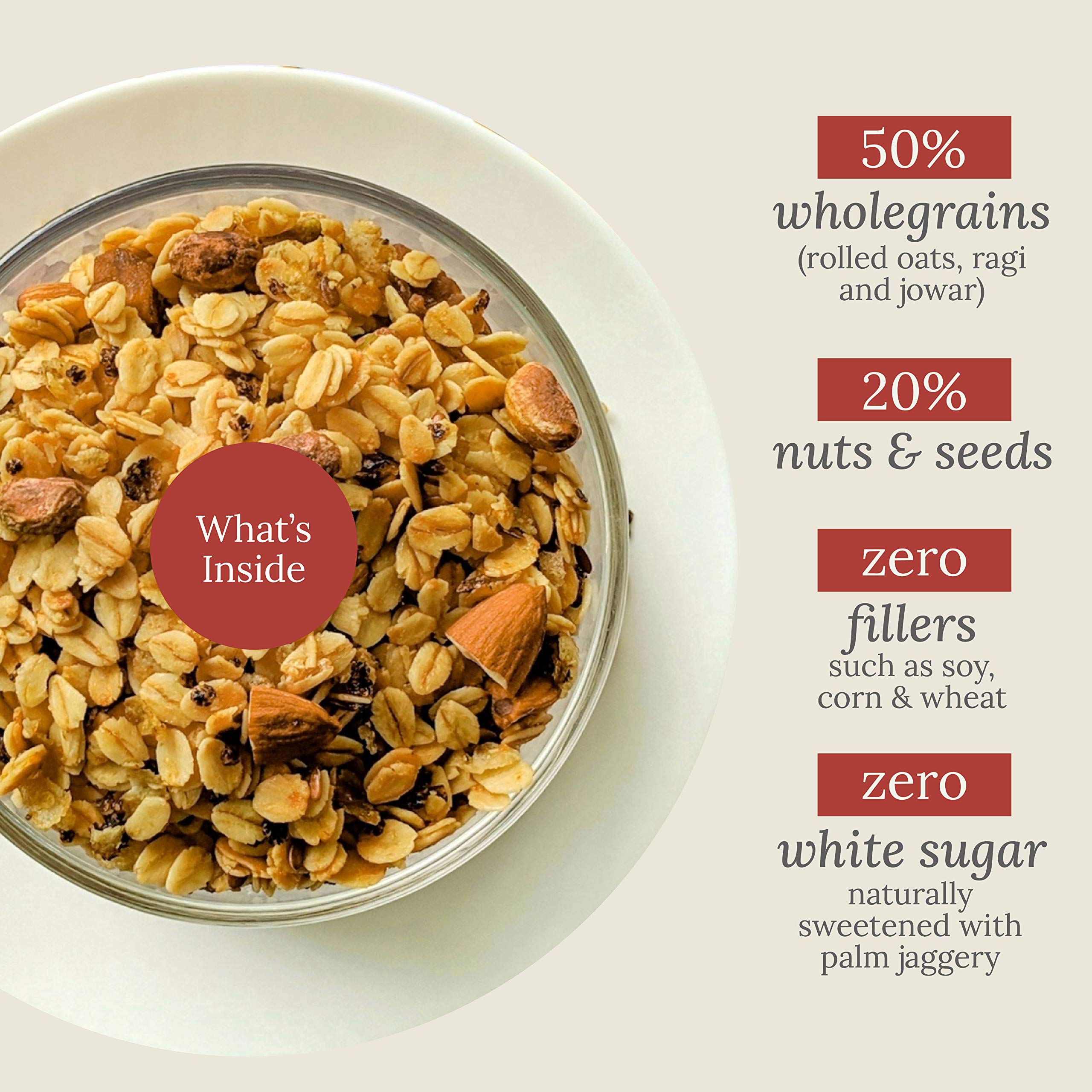Gluten Free Cereal : No soy no wheat no corn non GMO. Hand crafted in small batches to ensure quality. Packed with plant-based nutrition. Packed with almonds and the goodness of grain based proteins from the rolled oats and millets.