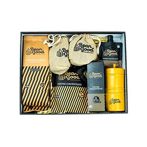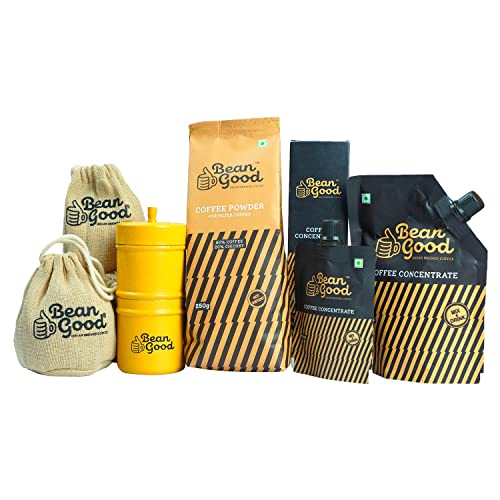 Coffee Gift Hamper Consists of Filter Coffee Powder Coffee Concentrate & South Indian Coffee FilterUpgrade your morning with the best of Indian Brewed Coffee. At Bean Good we source our coffee beans from Chikmagalur the birthplace of coffee in India. We are passionate about coffee and we have a simple mission to make sure you can have the best cup of coffee anytime anywhere! A real boon for the ultimate coffee lovers to get the mind-blowing experience with every dip and sip. Coffee Beans are finely roasted to perfection. The perfect cup for every palette. Explore our complete range of products to find your Bean Good match!Adding oodles of character aroma and health benefits to your standard coffee brew chicory is what sets Bean Good's Indian Coffee leagues apart from the rest. Chicory is believed to be beneficial for our health including gut health blood sugar & weight management effective for inflammation conditions. Bringing chicory into your life is easy just have yourself a delicious cup of Bean Good's Classic Indian coffee.South Indian Mothers! Instructions to make filter coffee with stainless steel coffee filter: Filter coffee is brewed using a coffee filter that has two cylinders. The top Cylinder contains Pinholes. The idea is for the ''decoction'' to drip down from the top cylinder through the tiny pinholes into the bottom cylinder.