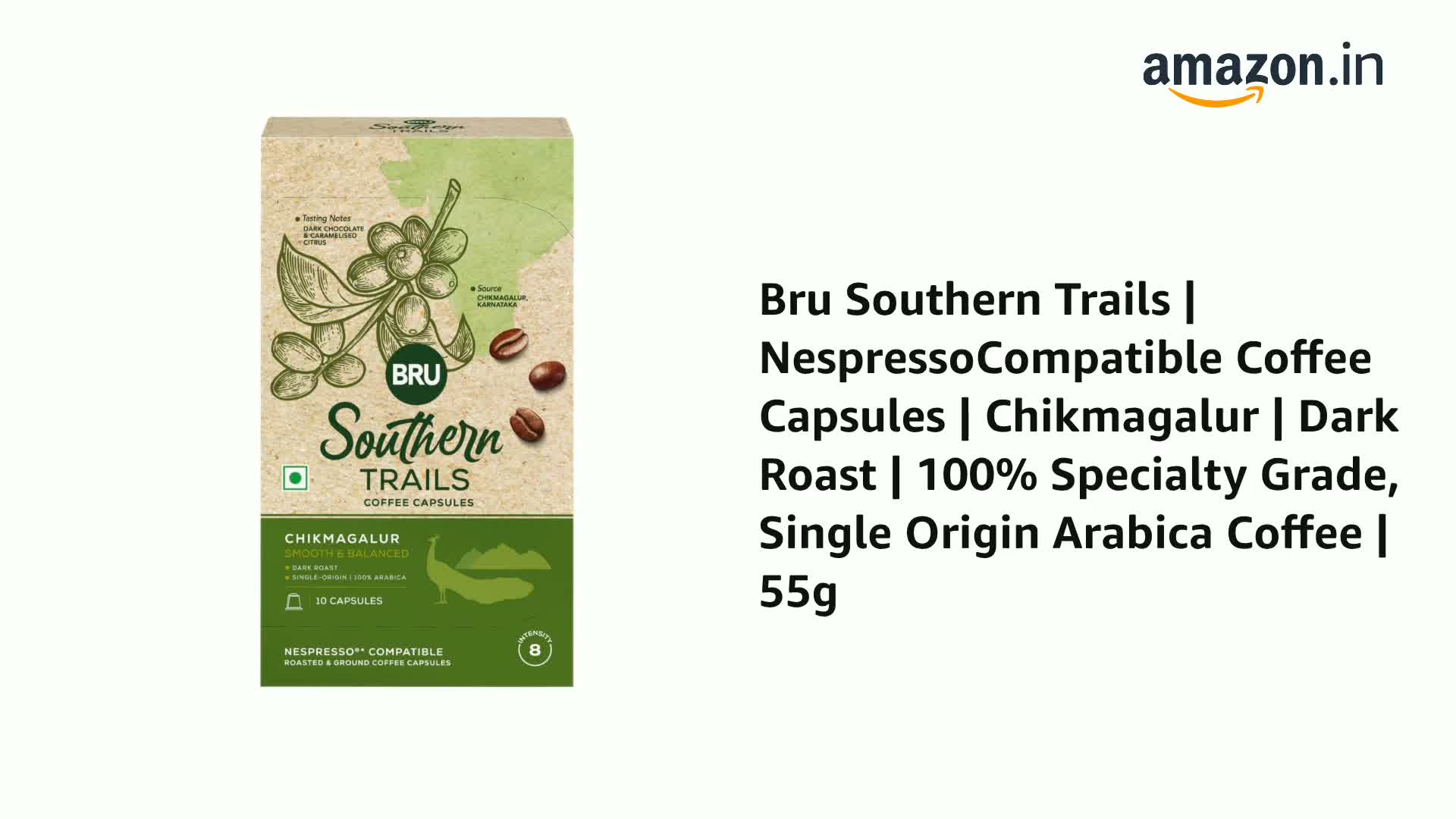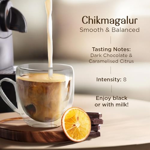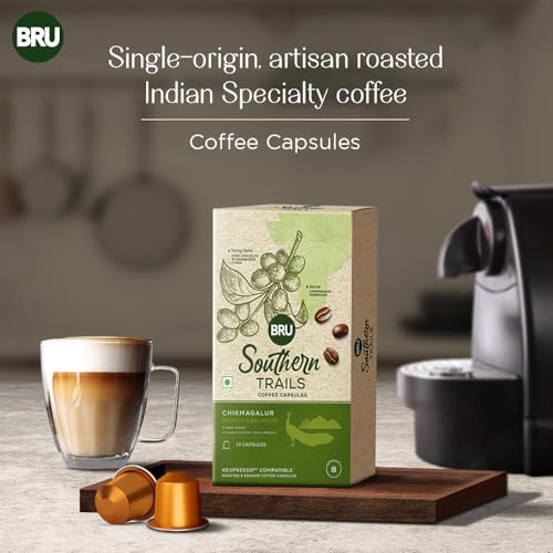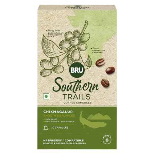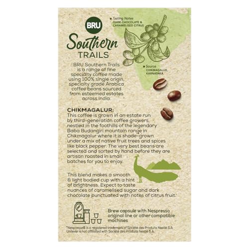 BRU Southern Trails is a range of fine specialty coffee made using 100% single origin specialty grade Arabica coffee beans sourced from esteemed estates across India. This coffee is grown in an estate run by third-generation coffee growers nestled in the foothills of the legendary Baba Budangiri mountain range in Chikmagalur where it is shade-grown under a mix of native fruit trees and spices like black pepper. The very best beans are selected and sorted by hand before they are artisan roasted in small batches for you to enjoy. With our Coffee Capsules great tasting coffee is now at your fingertips. Just brew them using your Nespresso® original line machine. Our Chikmagalur blend is Dark Roasted and makes a smooth and medium-bodied cup with a lingering swirl of brightness. Expect to taste nuances of caramelised sugar and dark chocolate punctuated with notes of citrus fruit. This product contains 10 capsules with an Intensity score of 8. Enjoy an extraordinary coffee experience with BRU Southern Trails - also available in Roasted & Ground Coffee Bags and Easy Pour Coffee Bags. Do note that this is not an Instant Coffee. These are coffee capsules that are compatible with your Nespresso® original line machine.