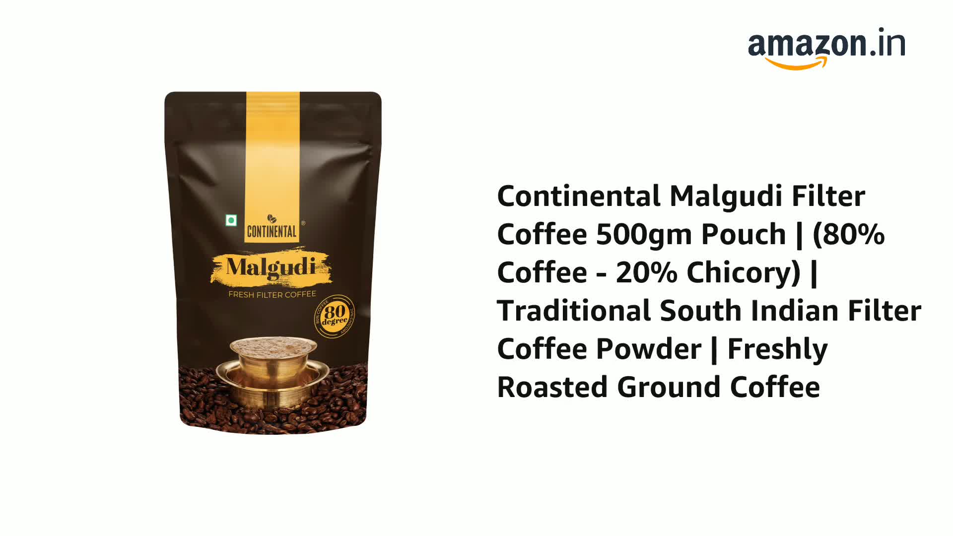 Continental Malgudi Filter Coffee Powder | 500gm Pouch | 80% Coffee - 20% Chicory | Traditional South Indian Filter Coffee Powder | Roasted Ground Coffee | Smooth Flavour and Rich Aroma |