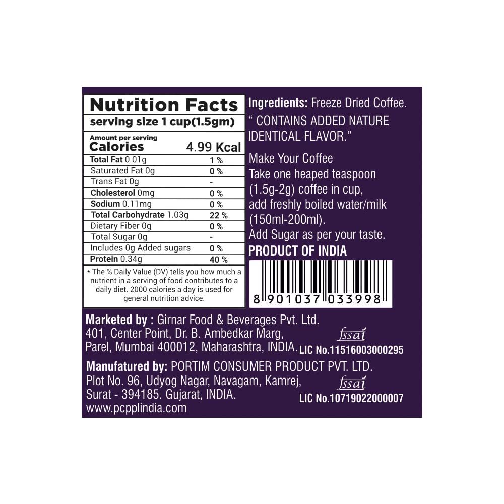 When it feels like the day is slowing an instant cup of this coffee will surely keep you going! Crisp coffee aroma dark liquor that is flavourful but smooth on the palate - Girnar KoCafe outshines the usual coffee brew in every way. For this espresso we use special Freeze-Dried Coffee Crystals to better preserve the robust flavour of every coffee bean. It is tastefully curated for a strong full-bodied brew that goes well with milk and sugar too.