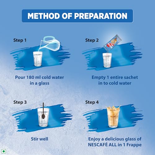 JUST ADD COLD WATER! Experience the ultimate convenience and indulgence with NESCAFE All In 1 Frappe Instant Cold Coffee Mix Powder. This premix sachets of rich and creamy coffee goodness offers a quick and effortless way to enjoy a refreshing cold coffee anytime anywhere. Simply add cold water stir and enjoy a refreshing glass! NESCAFE All In 1 Frappe is perfect for on-the-go moments and ensures consistent taste and quality in every sip. Whether you're at home at work or on an adventure indulge in the smooth and delicious taste of NESCAFE's instant cold coffee!