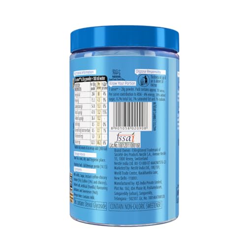 JUST ADD COLD WATER! Experience the ultimate convenience and indulgence with NESCAFE All In 1 Frappe Instant Cold Coffee Mix Powder. This premix offers rich and creamy coffee goodness and is a quick and effortless way to enjoy a refreshing cold coffee anytime anywhere. Simply add cold water stir and enjoy a refreshing glass! NESCAFE All In 1 Frappe's convenient jar packaging with a serving scoop offers you the flexibility to make your favorite cold coffee in your own way. It's perfect for any moment and ensures consistent taste and quality in every sip!Method of Preparation: Step 1 - Pour 180 ml cold water in a glass. Step 2 - Add 2 Scoops (approx. 28g) of premix into the cold water. Step 3 - Stir well until completely dissolved. Step 4 -Enjoy a delicious glass of NESCAFE All in 1 Frappe. Storage Instructions: Store in a cool dry & hygienic place. Use clean and dry scoop/spoon for using the product. Consume within 25 days of opening the inner pouch.
