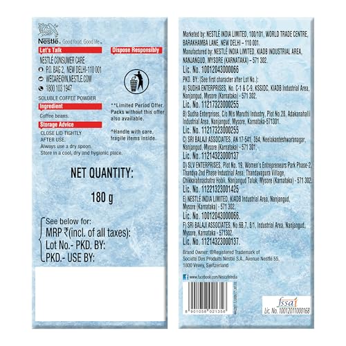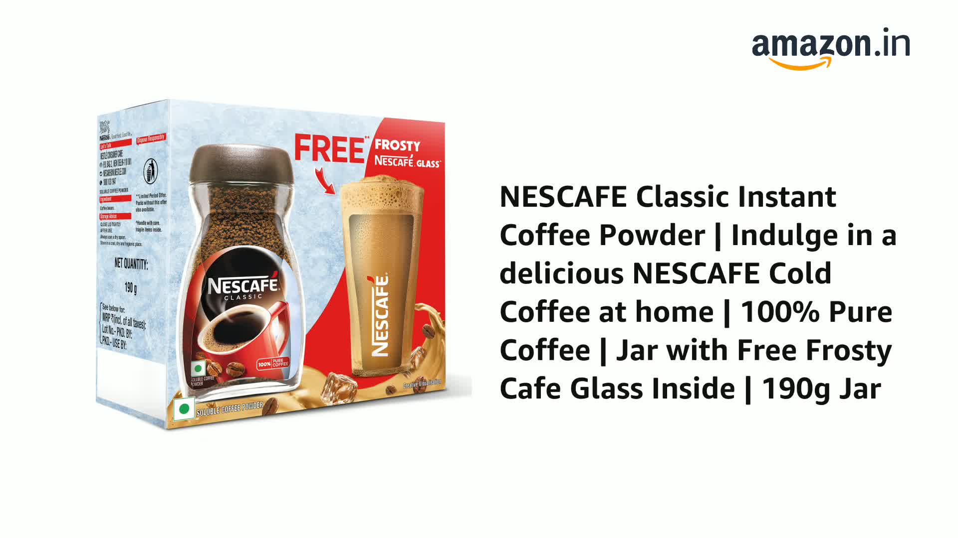NESCAFE Classic Instant Coffee Powder | Great start to your morning | 100% Pure | Free Frosty Glass | 190g/180g Jar (Weight May Vary)