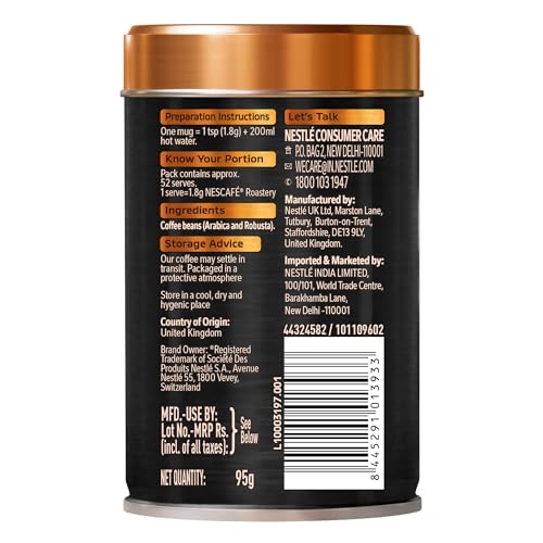 Savour intense dark roast crafted by our master roasters to create a sophisticated taste. NESCAFE Roastery is carefully crafted with high-quality Arabica and Robusta beans. These select beans are then expertly roasted in two individual batches by our master roasters to bring out delicate flavours and rich aroma. The dark roast coffee delivers a rich and intense experience with notes of luscious dark chocolate and the irresistible aroma of freshly roasted nuts. Indulge in the rich and luxurious coffee experience of the NESCAFE Roastery with just one sip of this exquisite blend. Usage Instructions: Add 1 tsp. of the Dark Roast coffee powder in 200ml of hot water stir and savour! Storage Advice: Our coffee may settle in transit. Packaged in a protective atmosphere. Store in a cool dry & hygienic place.