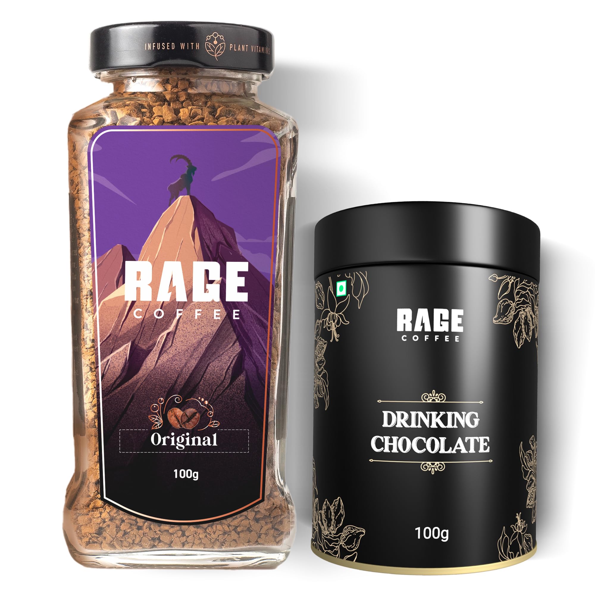 HomeGroceryBeveragesCoffeeRage Coffee Combo - Instant Coffee And Hot Chocolate Drink Powder Mix | Original Coffee Blend | Make Great Coffee Mocha | 100 gms Each | Made In India