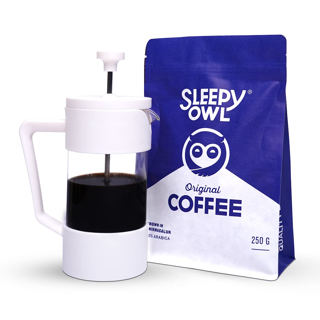 HomeGroceryBeveragesCoffeeSleepy Owl French Press Coffee Gift Set | (350mL) with Original Ground Coffee (250g) | Coarse Grind | 100% Arabica | Ideal Gift for Coffee Lovers | Wedding Birthday Gift for Men Women
