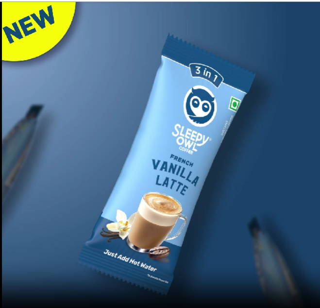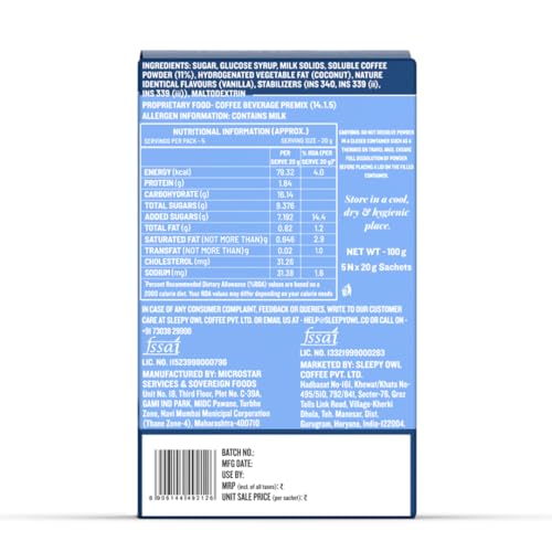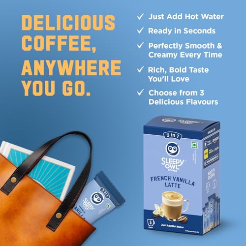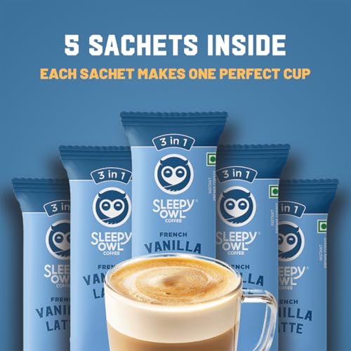 HomeGroceryBeveragesCoffeeSleepy Owl French Vanilla Latte Instant Coffee Premix Sachets | 3 in 1 Coffee Sachet | Frothy & Creamy Cafe-Style Coffee at Home | All in One Premix Coffee Sachet Just Add Hot Water | 100g (5 x 20g)