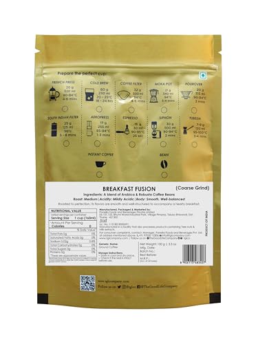 Breakfast Fusion blend is crafted from premium Arabica and Robusta Coffee beans from finest coffee plantations of South India keeping in mind everything a coffee aficionado appreciates in their morning What they've found is that people like their morning coffee to be brightly acidic smooth balanced and rich in flavour. The roast profile is evenly balanced not too light but retains enough caffeine to help you begin your day without jitters. The coffee is superbly smooth with a slight lingering finish. It is refreshing with a well-balanced aftertaste great for the first early morning cup of coffee; leaving you yearning for a second refill.