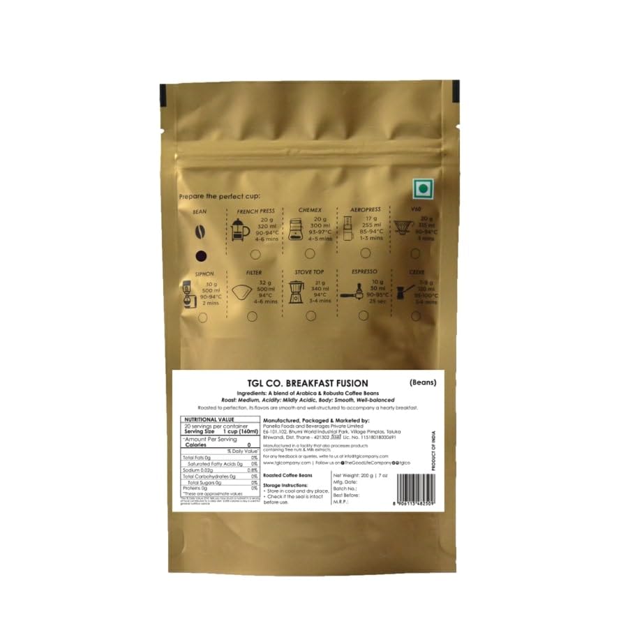TGL Co. Breakfast Fusion - Grounded Coffee/Beans (200 Gm) | Anti Oxidant | Boost Energy | No Artificial Flavour | Blend of Arabica & Robusta | Medium Roast | Washed & Naturals