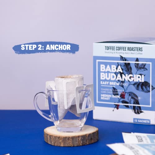 Toffee Coffee Roasters | Baba Budangiri Coffee | Free Enamel Mug | Easy Brew (Hot Brew) Coffee Bag | Pack of 12 Sachets | Medium Dark Roast | Coffee Notes: Toasted Nuts Earthy & Chocolate Notes