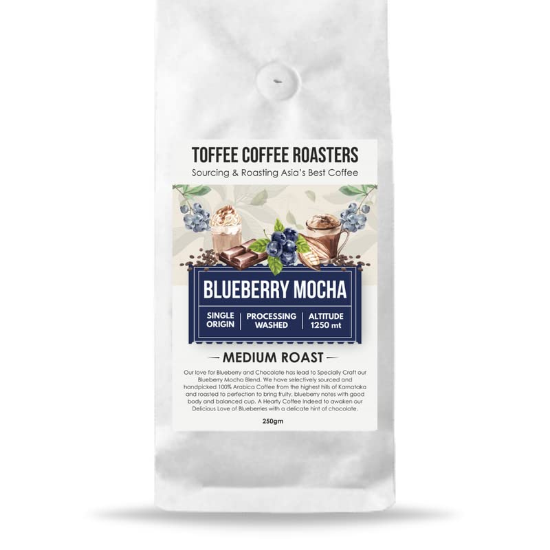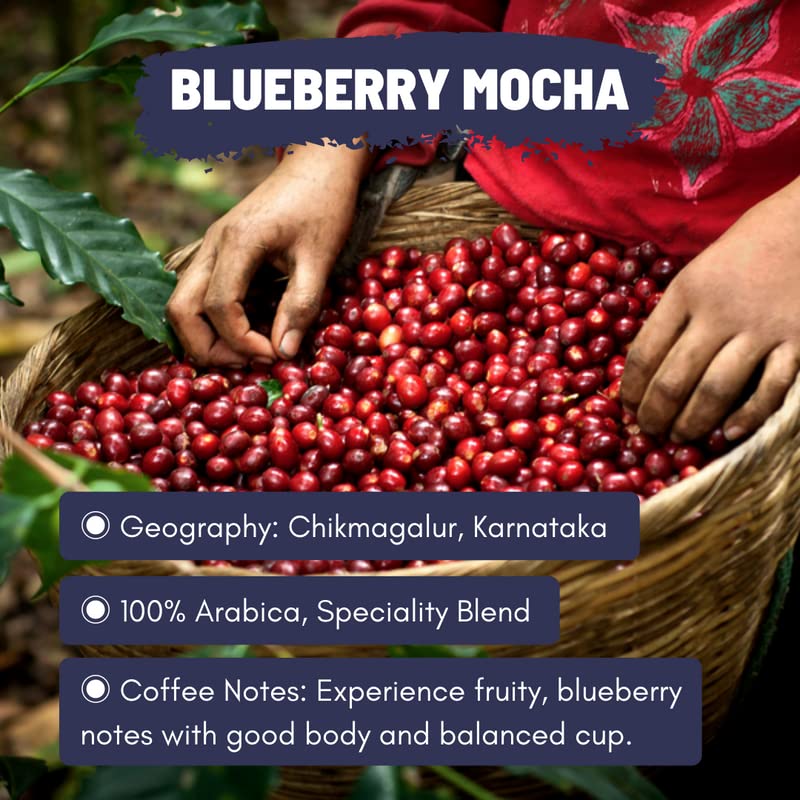 ABOUT THE COFFEE: Our Love for Blueberry and Chocolate has lead to specially craft our Blueberry Mocha Blend. We have selectively sourced and handpicked 100% Arabica Coffee from the highest hills of Karnataka and roasted to perfection to bring fruity blue