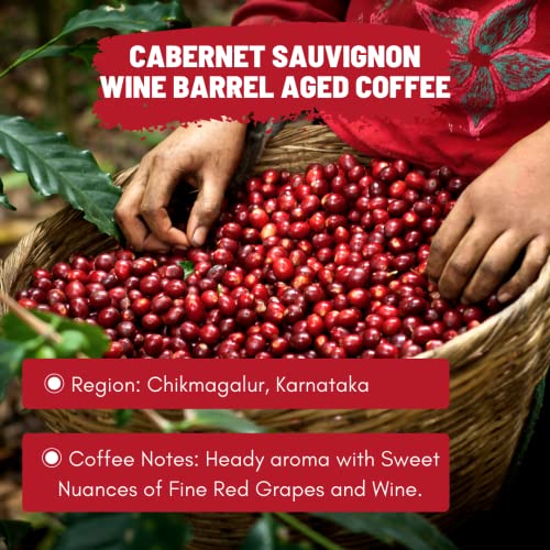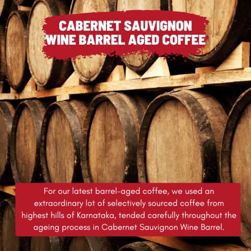WHAT IS BARREL AGED COFFEE? The Deepest Coffee Expertise Meets the legacy of world's most recognised Red Wine : Cabernet Sauvignon. For our latest barrel-aged coffee we used an extraordinary lot of selectively sourced coffee from highest hills of Karnataka tended carefully throughout the ageing process in Cabernet Sauvignon Wine Barrel. The result is a Showstopper a cup that has a heady aroma with sweet nuances of fine red grapes and wine. A mingling of Coffee and traditions.This 100% Arabica Coffee grows at an altitude of 3000 ft. The altitude at which a bean is grown has an affect on the beans flavor. Coffee grown at higher elevations tends to be of higher quality and with that high quality comes more complex flavor notes than coffee grown at lower elevations.