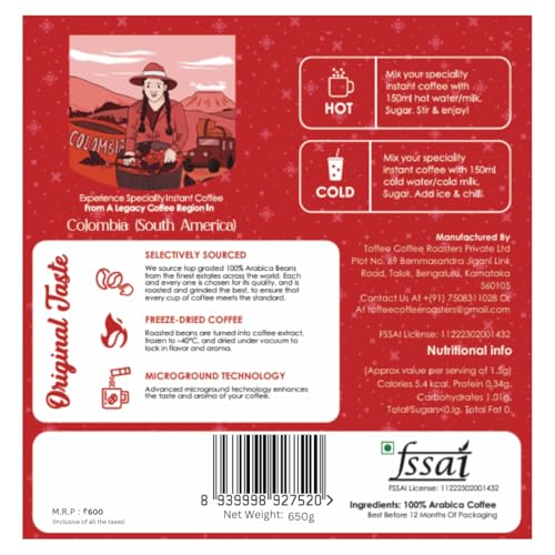 Introducing Speciality Instant Coffees from Toffee Coffee Roasters ! Columbia Coffee: But how do we make our Instant coffee brew as good as freshly roasted and brewed coffee? Lets find out! this is The Old way: The Traditional instant coffee is made by subjecting low quality beans through a very harsh process which removes most of flavour and aroma. No wonder why most Instant Coffees taste BAAAD! this is The Toffee Coffee Roasters way! We go on across the world to source the right beans from the coffee heavens of the world: Columbia are the legacy coffee regions. We then roast it slowly in small batches. The roasted beans are then converted into coffee extract and then frozen to about 40°C - cut into granules. The frozen granules are then dried at low temperature and under vacuum which protects the overall flavour and aroma of coffee. On top of it we use Micro-ground Technology that adds on to your final cup of coffee! Add water and milk (or sugar or cream) and you have coffee as good as your freshly brewed coffee.
