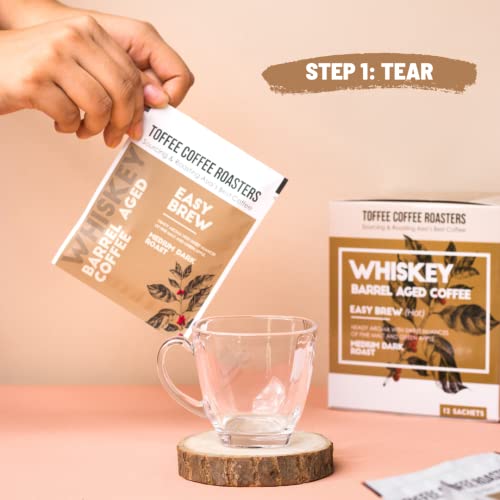 HomeGroceryBeveragesCoffeeToffee Coffee Roasters | Easy Brew (Hot Brew) Coffee | Single Malt Whiskey Barrel Aged Grounded Coffee | Pack of 8 Sachets | No Equipment Required | Medium Dark Roast |Notes: Fine Malt & Green Apple