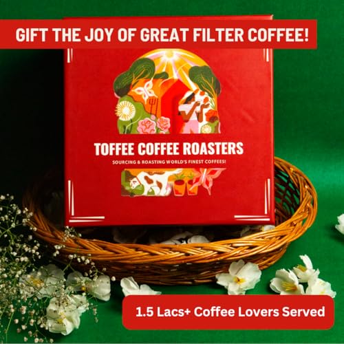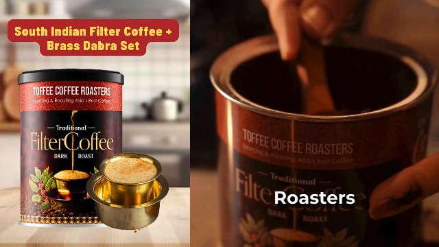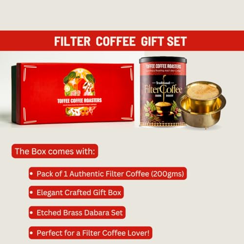 Toffee Coffee Roasters | Filter Coffee + Dabra Gift Set | Elegant Brass Dabara | South Indian Coffee Glass Set Bowl and Glass | South Indian Gifts Diwali Coffee Gift Hamper For Family & Friends