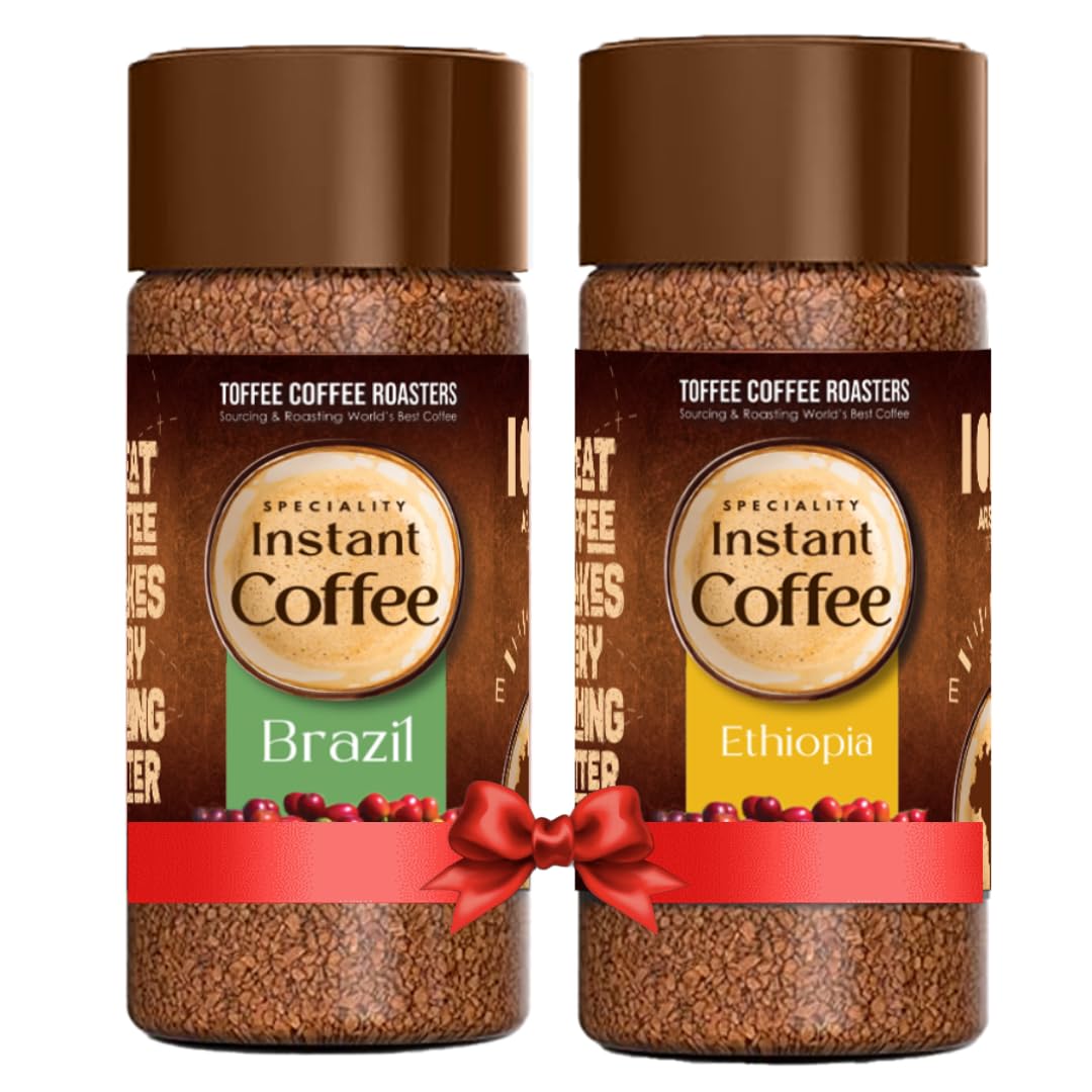 Toffee Coffee Roasters Instant Coffee 50 gm Each - Pack of 2 Ethiopia & Brazil Instant Coffee | As Seen On Shark Tank | Arabica Coffee Powder | Ready in Seconds | Microground Technology