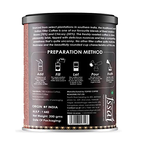 Toffee Coffee Roasters | Pack of 1 (200g) South Indian Filter Coffee| As Seen On Shark Tank | Specialty Blend| Traditional Dark Roast Signature Filter Grounded Coffee