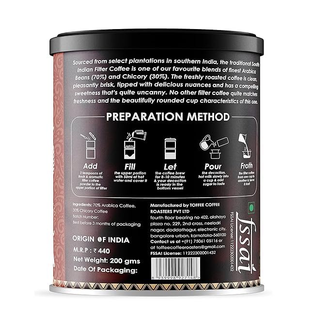 HomeGroceryBeveragesCoffeeToffee Coffee Roasters | Pack of 4 x 200gm (800gms) South Indian Filter Coffee| As Seen On Shark Tank | Specialty Blend| Traditional Dark Roast Signature Filter Coffee